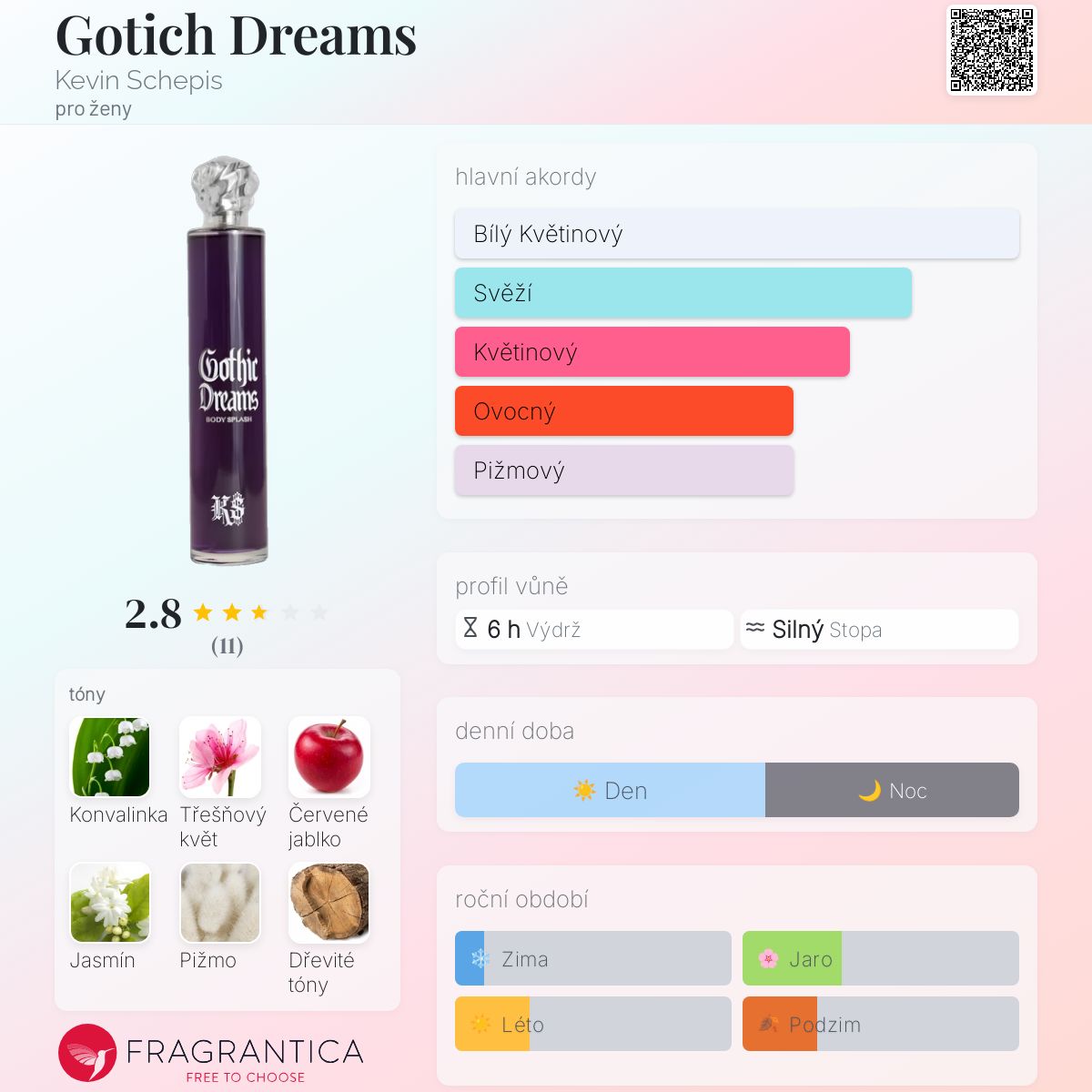 Gotich Dreams podle Kevin Schepis je Floral Fruity vůně pro ženy. Gotich Dreams byl/a uveden/a v roce 2023. Vrchní tóny jsou Třešňový květ a Červené jablko; střední tóny jsouKonvalinka a Jasmín ; základní tóny jsou Pižmo a Bílé dřevo.
