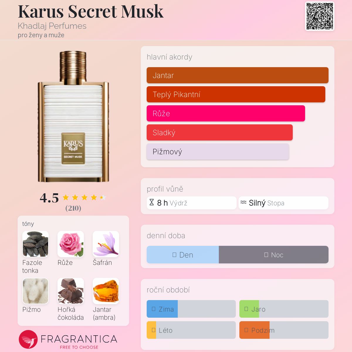 Karus Secret Musk podle Khadlaj Perfumes je vůně pro ženy a muže. Karus Secret Musk byl/a uveden/a v roce 2024. Vrchní tóny jsou Šafrán a Červené ovoce; střední tóny jsouFazole tonka, Růže a Čokoláda ; základní tóny jsou Pižmo, Jantar (ambra), Ambra, Dubový mech a Mech.