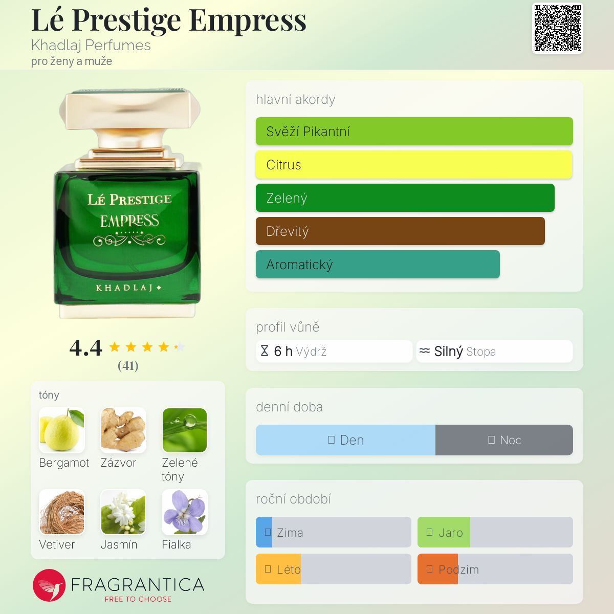 Lé Prestige Empress podle Khadlaj Perfumes je Floral vůně pro ženy a muže. Toto je nová vůně. Lé Prestige Empress byl/a uveden/a v roce 2025. Vrchní tóny jsou Bergamot, Zázvor a Bylinné tóny; střední tóny jsouJasmín, Fialka a Růže ; základní tóny jsou Vetiver, Pačuli a Cedr.