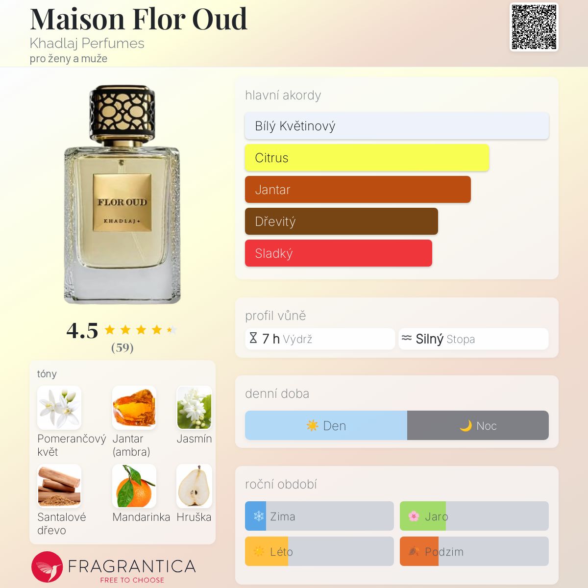 Maison Flor Oud podle Khadlaj Perfumes je vůně pro ženy a muže. Maison Flor Oud byl/a uveden/a v roce 2023. Vrchní tóny jsou Mandarinka a Růže; střední tóny jsouPomerančový květ, Jasmín a Hruška ; základní tóny jsou Jantar (ambra) a Santalové dřevo.