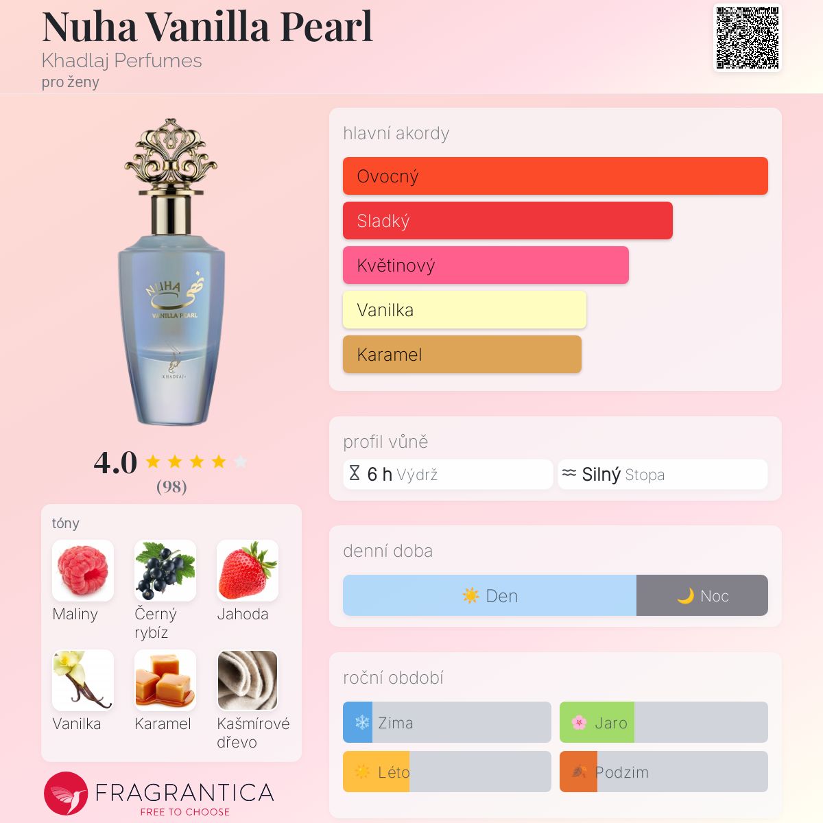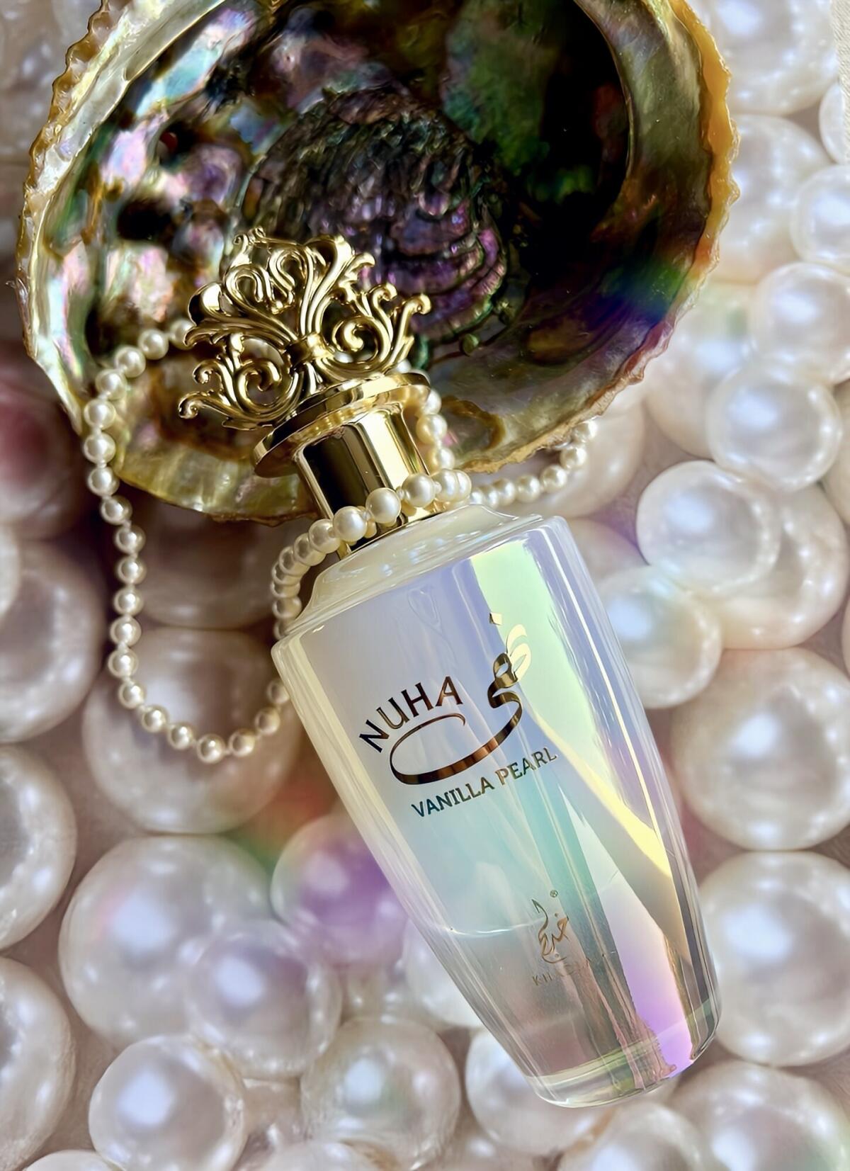 Nuha Vanilla Pearl podle Khadlaj Perfumes je Floral Fruity Gourmand vůně pro ženy. Toto je nová vůně. Nuha Vanilla Pearl byl/a uveden/a v roce 2025. Vrchní tóny jsou Černý rybíz, Jahoda a Frézie; střední tóny jsouMaliny, Kašmírové dřevo a Magnólie ; základní tóny jsou Vanilka, Karamel a Mech.