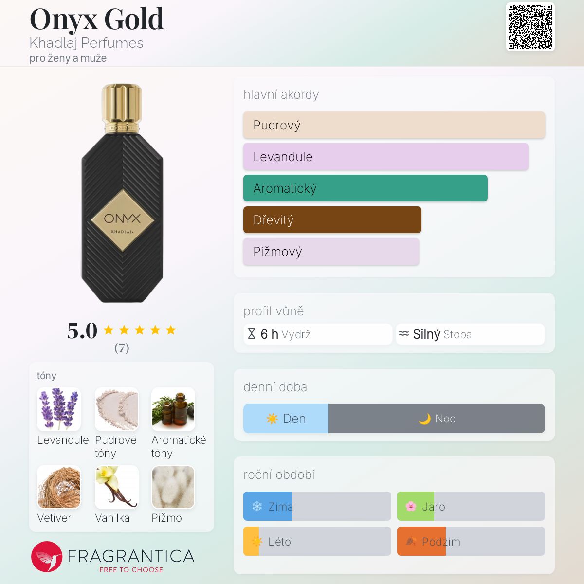 Onyx Gold podle Khadlaj Perfumes je Aromatic vůně pro ženy a muže. Toto je nová vůně. Onyx Gold byl/a uveden/a v roce 2025. Vrchní tóny jsou Aromatické tóny a Vanilka; střední tóny jsouLevandule a Pudrové tóny ; základní tóny jsou Vetiver a Pižmo.