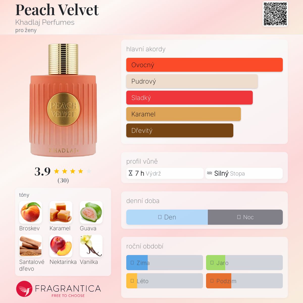 Peach Velvet podle Khadlaj Perfumes je Floral Fruity Gourmand vůně pro ženy. Peach Velvet byl/a uveden/a v roce 2023. Vrchní tóny jsou Broskev, Guava a Nektarinka; střední tóny jsouJantar (ambra), Vanilka, Skořice a Zázvor ; základní tóny jsou Santalové dřevo, Karamel a Pižmo.