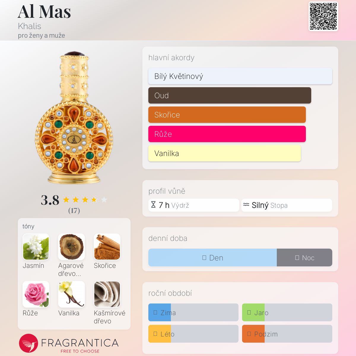 Al Mas podle Khalis je Orientální vůně pro ženy a muže. Vrchní tóny jsou Agarové dřevo (oud) a Skořice; střední tóny jsouJasmín a Čajová růže ; základní tóny jsou Vanilka a Kašmírové dřevo.