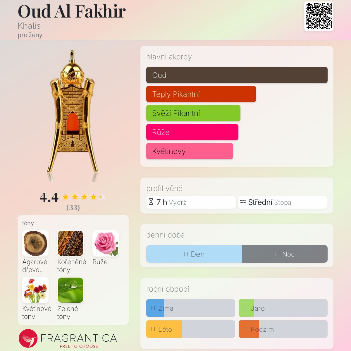 Oud Al Fakhir podle Khalis je Orientální Floral vůně pro ženy. Vrchní tóny jsou Kořeněné tóny a Květinové tóny; střední tón jeBylinné tóny ; základní tóny jsou Agarové dřevo (oud) a Bulharská růže.