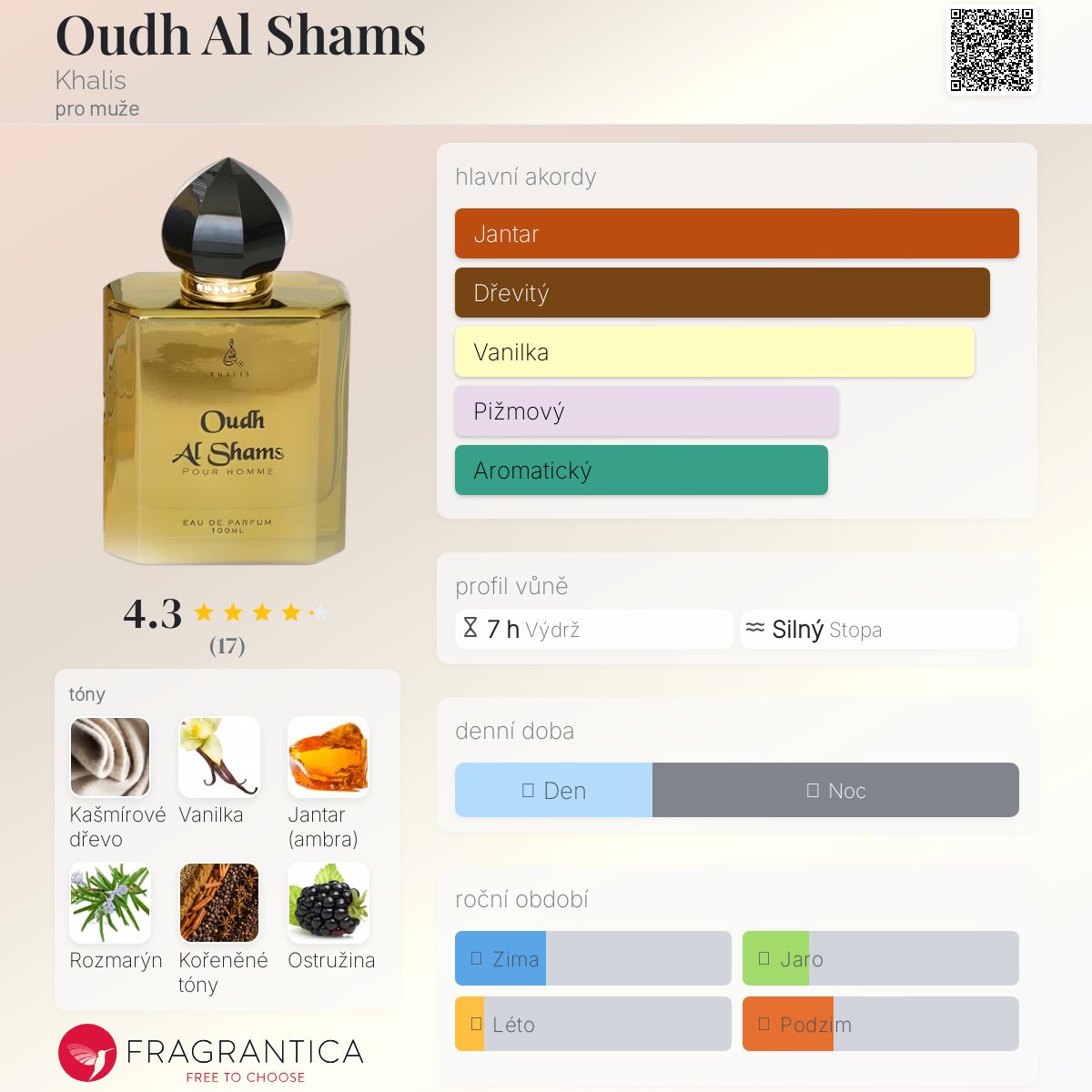 Oudh Al Shams podle Khalis je Orientální Woody vůně pro muže. Vrchní tóny jsou Rozmarýn a Kořeněné tóny; střední tóny jsouJantar (ambra) a Ostružina ; základní tóny jsou Kašmírové dřevo a Vanilka.