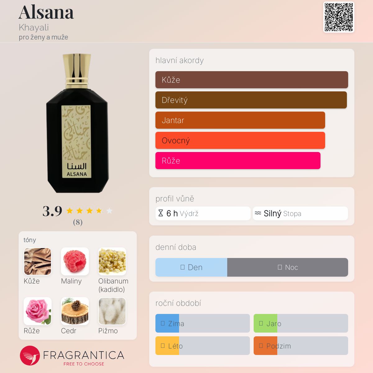 Alsana podle Khayali je Orientální Woody vůně pro ženy a muže. Alsana byl/a uveden/a v roce 2019. Vrchní tóny jsou Maliny, Olibanum a Růže; střední tóny jsouCedr, Pačuli, Lilie a Fialka ; základní tóny jsou Kůže, Pižmo, Agarové dřevo (oud), Vanilka a Jantar (ambra).