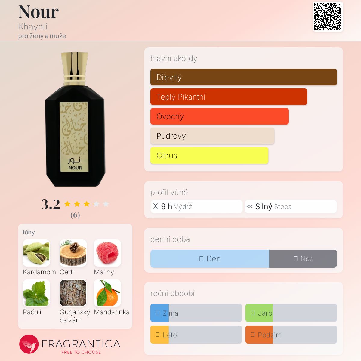 Nour podle Khayali je Woody vůně pro ženy a muže. Nour byl/a uveden/a v roce 2019. Vrchní tóny jsou Kardamom, Mandarinka, Jablko a Bergamot; střední tóny jsouCedr, Maliny, Pačuli, Růže, Kořen orris a Konvalinka ; základní tóny jsou Gurjanský balzám, Kůže, Vanilka, Pižmo a Jantar (ambra).