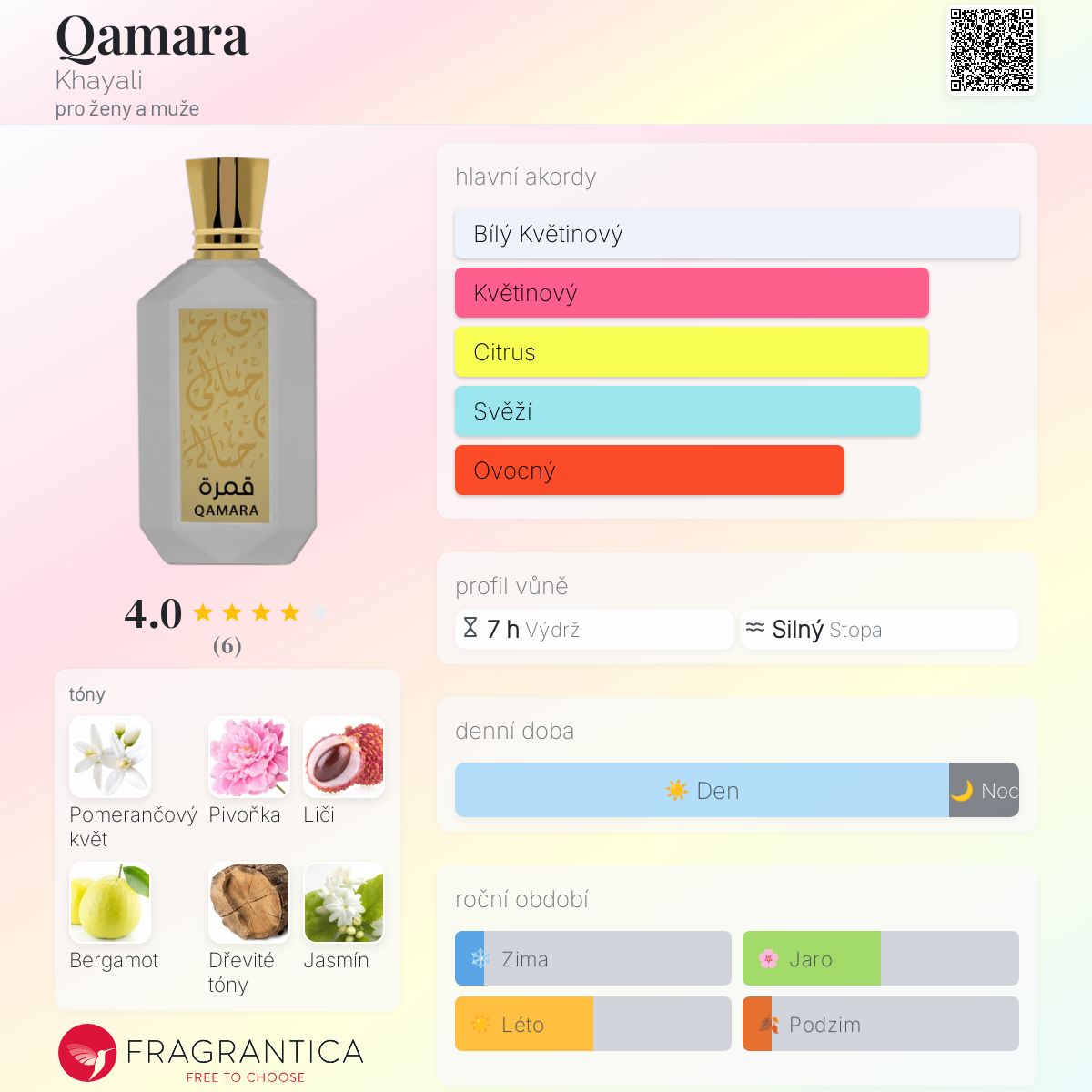 Qamara podle Khayali je Floral Fruity vůně pro ženy a muže. Toto je nová vůně. Qamara byl/a uveden/a v roce 2024. Vrchní tóny jsou Liči, Bergamot a Broskev; střední tóny jsouPomerančový květ, Pivoňka a Jasmín ; základní tóny jsou Dřevité tóny, Pižmo a Mech.