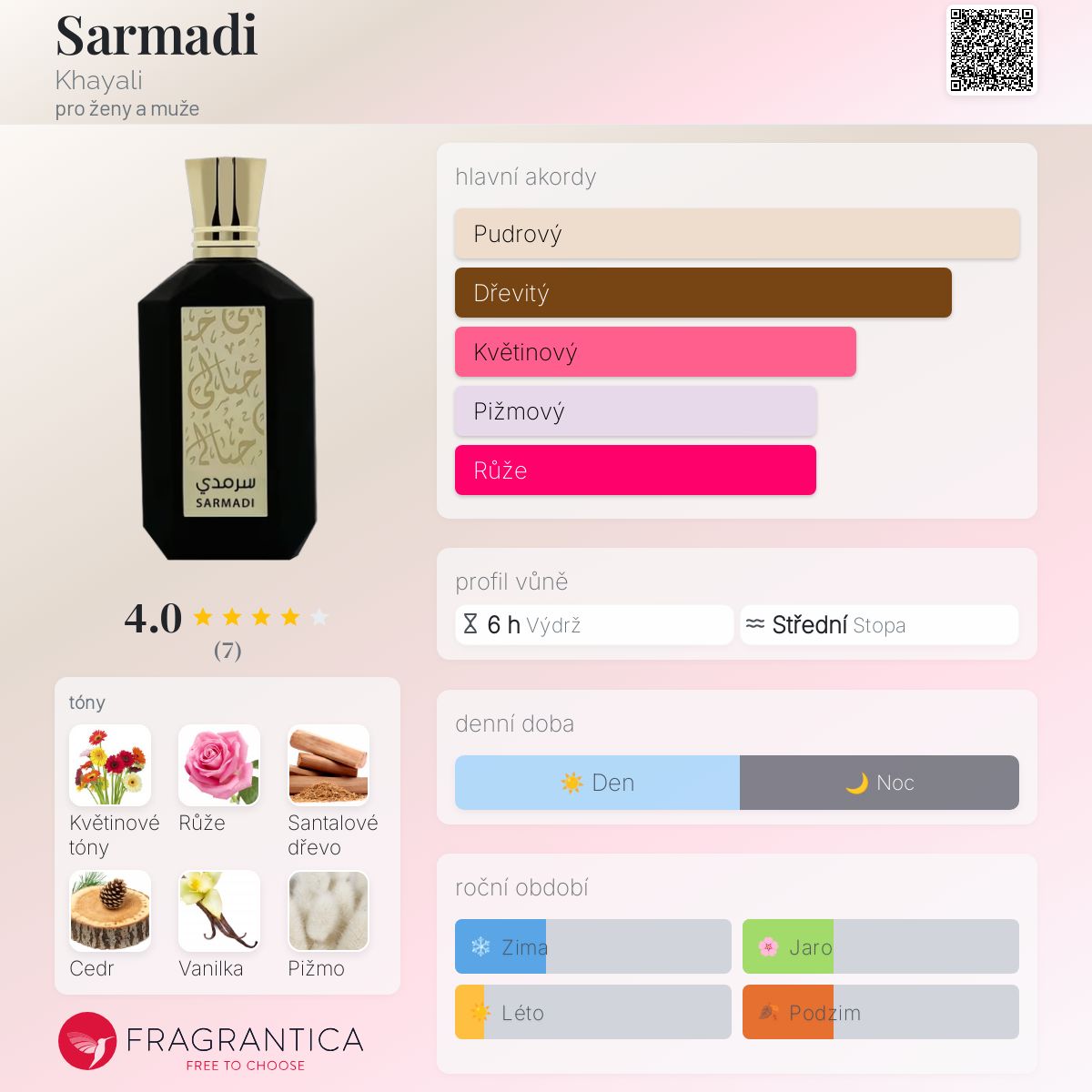 Sarmadi podle Khayali je Orientální Floral vůně pro ženy a muže. Vrchní tóny jsou Květinové tóny a Růže; střední tóny jsouSantalové dřevo, Cedr a Vanilka ; základní tóny jsou Vanilkový cukr, Pižmo a Pudrové tóny.