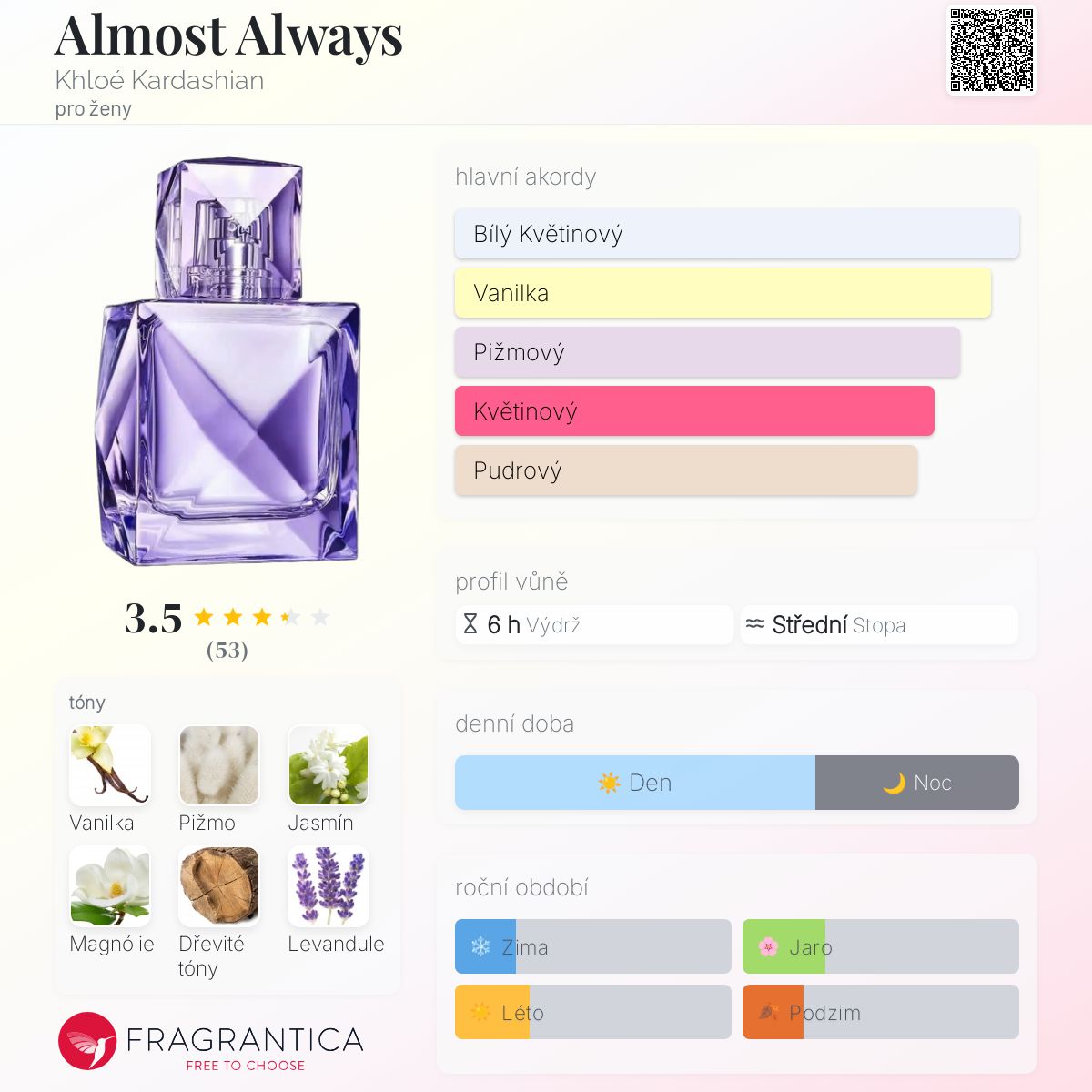 Almost Always podle Khloé Kardashian je Floral Woody Musk vůně pro ženy. Toto je nová vůně. Almost Always byl/a uveden/a v roce 2025. "Nosem" za touto vůní je Alberto Morillas. Vrchní tóny jsou Magnólie a Levandule; střední tóny jsouJasmín mnohokvětý a Pomerančový květ ; základní tóny jsou Vanilka, Pižmo, Solární tóny, Palo Santo, Dřevité tóny a Kůže.