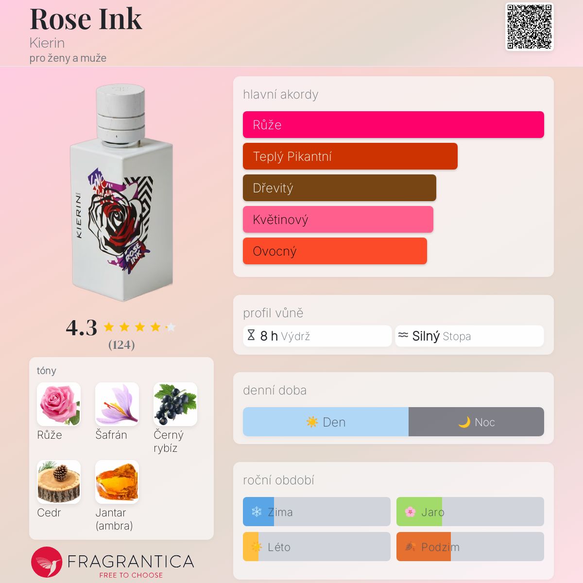 Rose Ink podle Kierin je Floral Woody Musk vůně pro ženy a muže. Rose Ink byl/a uveden/a v roce 2020. "Nosem" za touto vůní je Jérôme Epinette. Vrchní tóny jsou Šafrán a Černý rybíz; střední tón jeDamašská růže ; základní tóny jsou Cedr a Jantar (ambra).