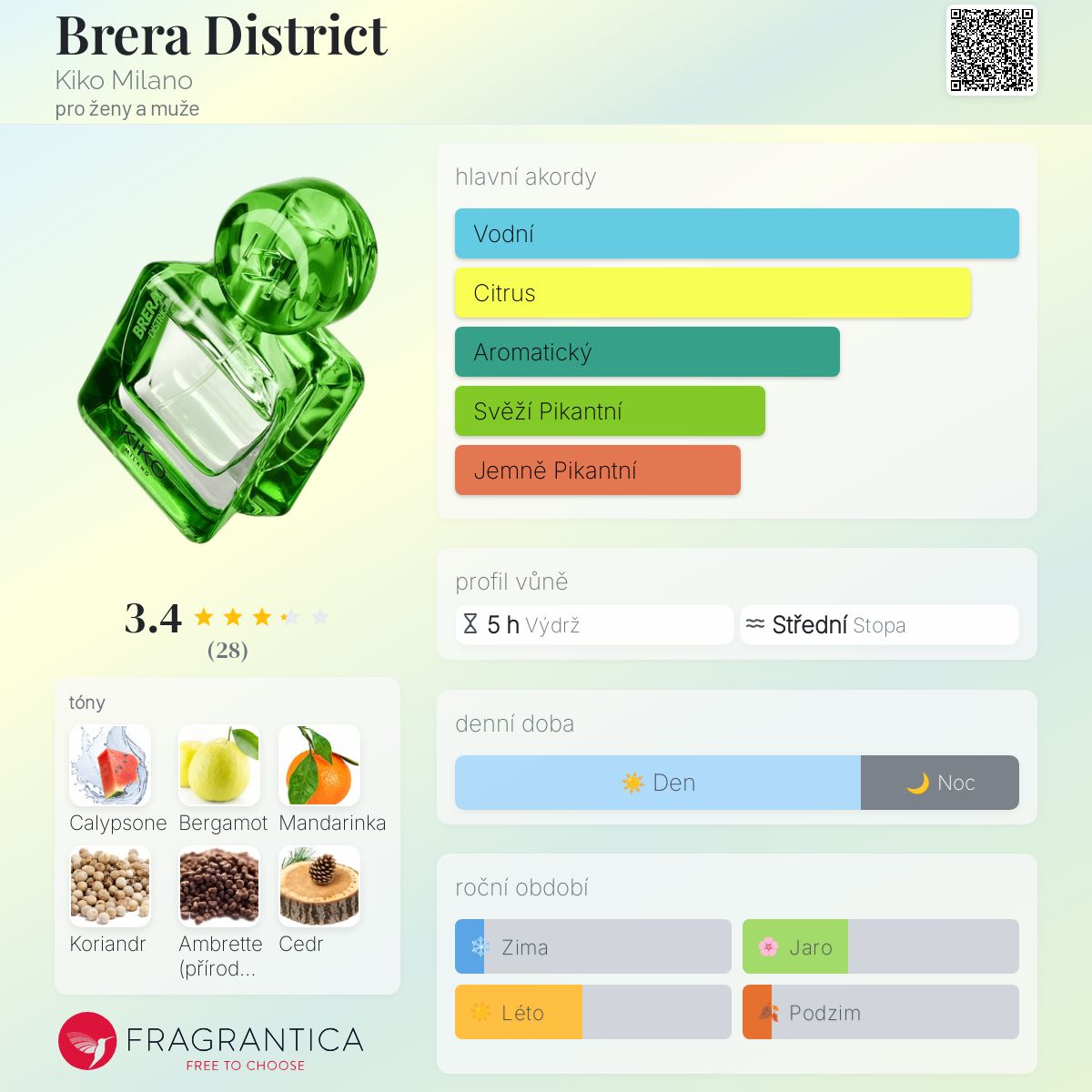 Brera District podle Kiko Milano je Woody Aromatic vůně pro ženy a muže. Toto je nová vůně. Brera District byl/a uveden/a v roce 2024. "Nosem" za touto vůní je Yann Vasnier. Vrchní tóny jsou Bergamot a Mandarinka; střední tóny jsouCalypsone a Koriandr ; základní tóny jsou Ambrette (přírodní pižmo) a Virginský cedr.