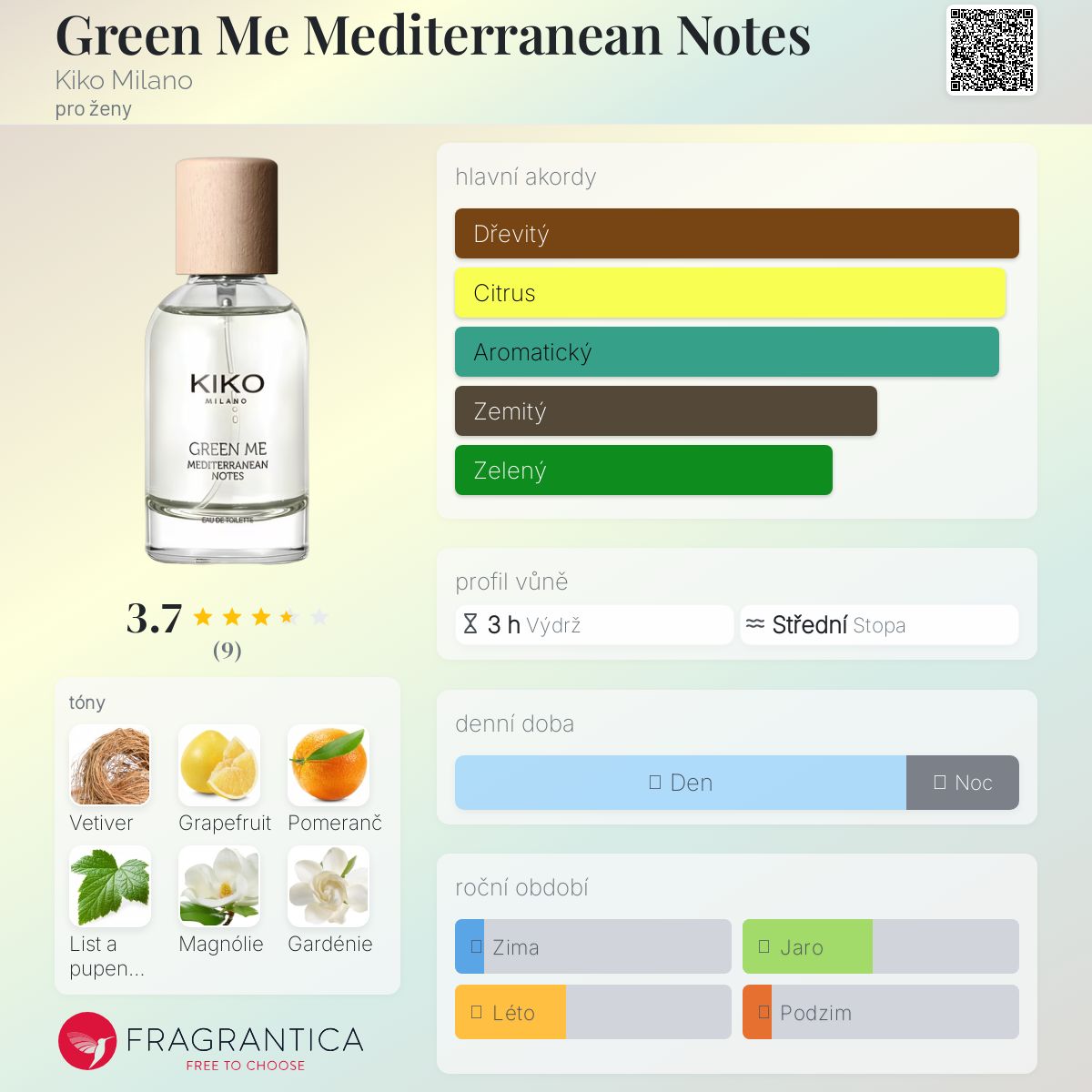Green Me Mediterranean Notes podle Kiko Milano je Floral vůně pro ženy. Green Me Mediterranean Notes byl/a uveden/a v roce 2021. Vrchní tóny jsou Růžový grapefruit a Pomeranč; střední tóny jsouČerný rybíz, Magnólie a Gardénie ; základní tóny jsou Vetiver a Brazilské růžové dřevo.