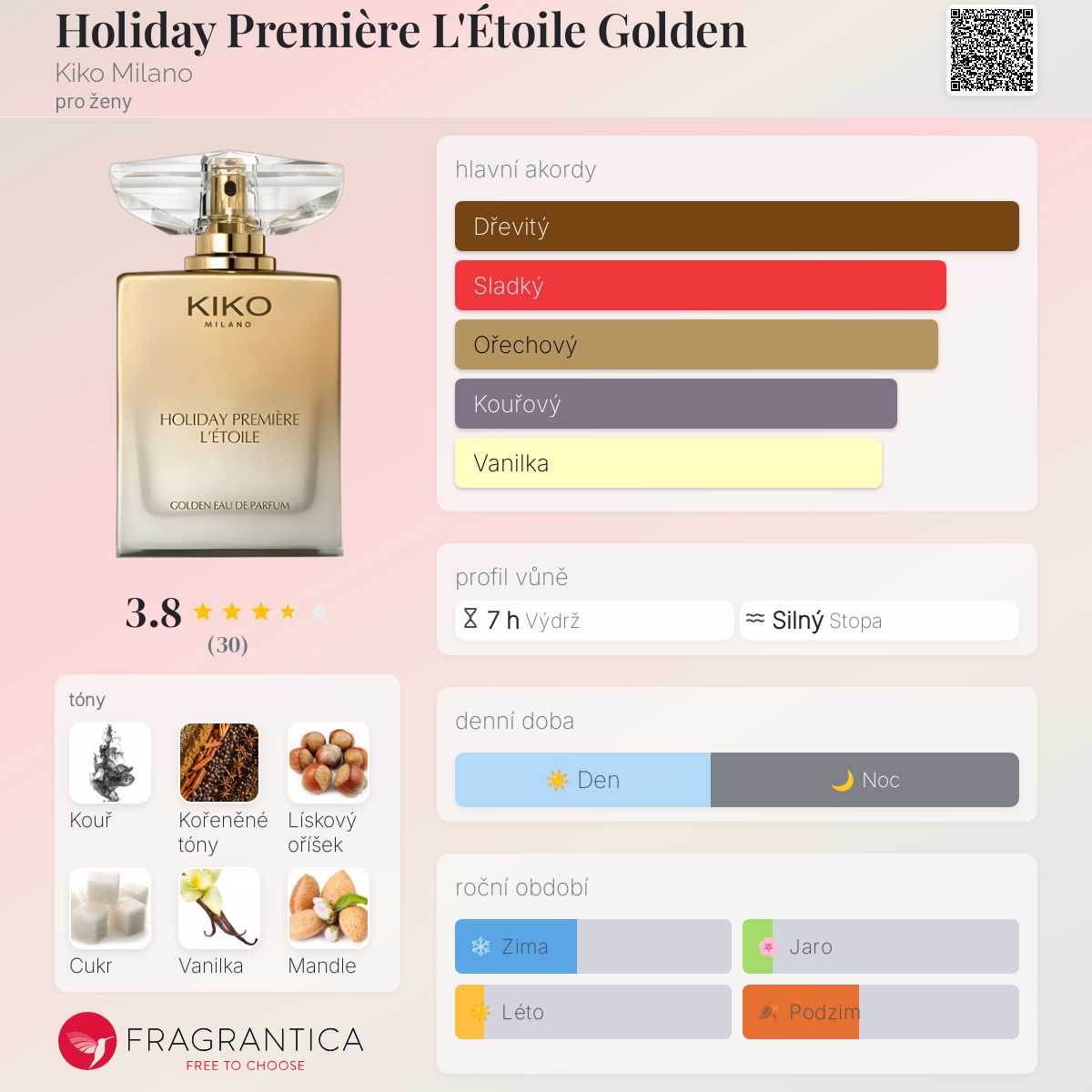 Holiday Première L'Étoile Golden podle Kiko Milano je vůně pro ženy. Toto je nová vůně. Holiday Première L'Étoile Golden byl/a uveden/a v roce 2023. Vrchní tóny jsou Kouř, Sladká mandle a Pomeranč; střední tóny jsouKoření, Lískový oříšek a Cukrová třtina ; základní tóny jsou Černý vanilkový lusk, Guajakové dřevo, Cedr a Jantar (ambra).