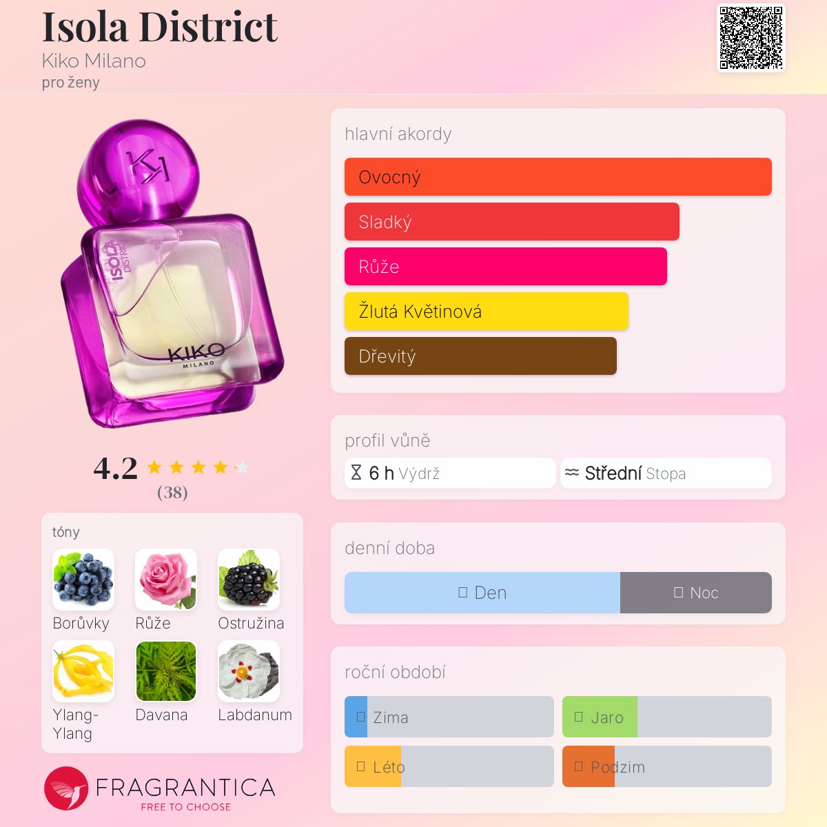 Isola District podle Kiko Milano je Floral Fruity vůně pro ženy. Toto je nová vůně. Isola District byl/a uveden/a v roce 2024. "Nosem" za touto vůní je Guillaume Flavigny. Vrchní tóny jsou Borůvky, Ostružina a Davana; střední tóny jsouRůže a Ylang-Ylang ; základní tóny jsou Labdanum a Cedr.