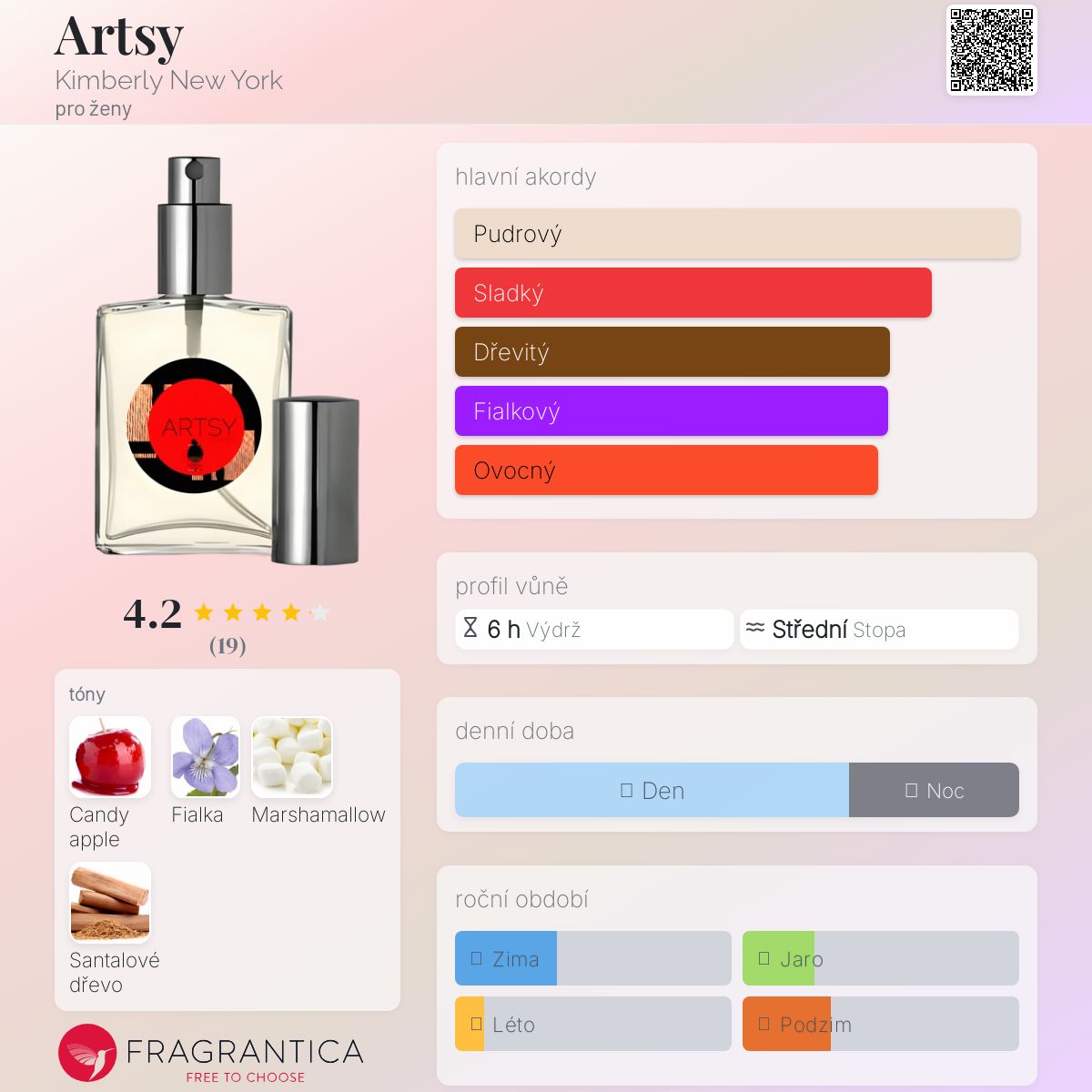 Artsy podle Kimberly New York je Floral Fruity Gourmand vůně pro ženy. Artsy byl/a uveden/a v roce 2016. "Nosem" za touto vůní je Kimberly Walker. Vrchní tón je Sladké jablko ; střední tóny jsouFialka a Marshamallow ; základní tón je Santalové dřevo.