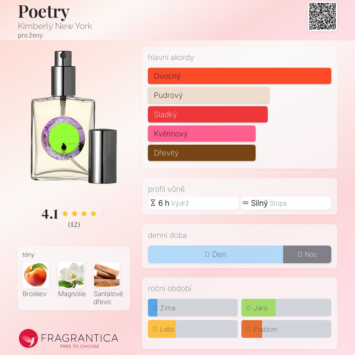 Poetry podle Kimberly New York je Floral Fruity vůně pro ženy. Poetry byl/a uveden/a v roce 2017. "Nosem" za touto vůní je Kimberly Walker. Vrchní tón je Broskev ; střední tón jeMagnólie ; základní tón je Santalové dřevo.