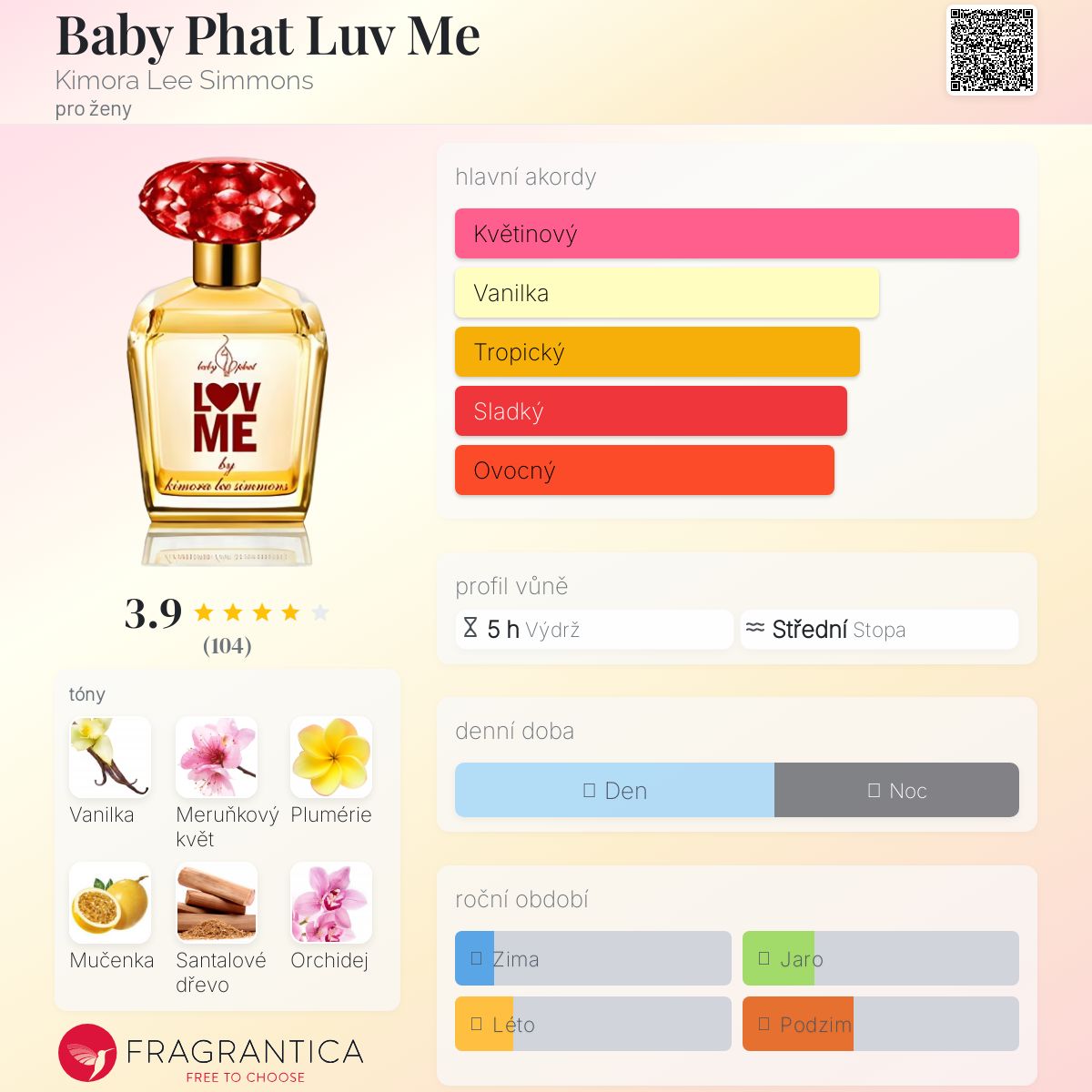 Baby Phat Luv Me podle Kimora Lee Simmons je Floral Woody Musk vůně pro ženy. Baby Phat Luv Me byl/a uveden/a v roce 2011. Vrchní tóny jsou Meruňkový květ, Mučenka a Mandarinka; střední tóny jsouPlumérie, Orchidej a Jasmín ; základní tóny jsou Vanilkový květ a Santalové dřevo.