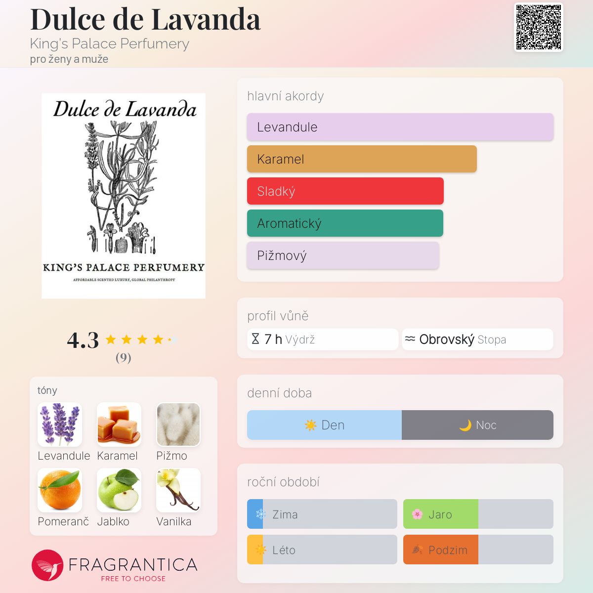 Dulce de Lavanda podle King's Palace Perfumery je Aromatic vůně pro ženy a muže. Dulce de Lavanda byl/a uveden/a v roce 2014. "Nosem" za touto vůní je Marlen Harrison.