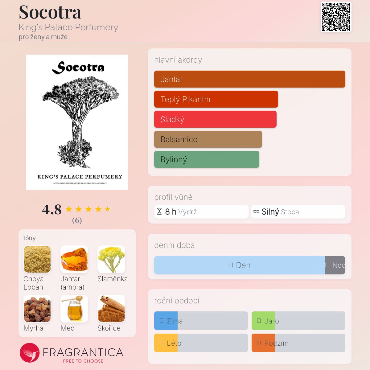 Socotra podle King's Palace Perfumery je Orientální vůně pro ženy a muže. Socotra byl/a uveden/a v roce 2014. "Nosem" za touto vůní je Marlen Harrison.