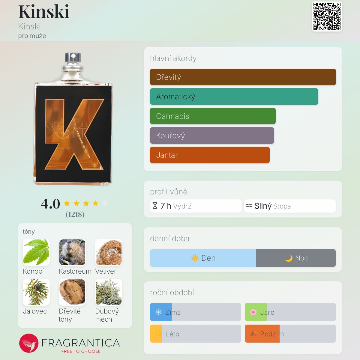 Kinski podle Kinski je Woody Aromatic vůně pro muže. Kinski byl/a uveden/a v roce 2011. "Nosem" za touto vůní je Geza Schoen. Vrchní tóny jsou Kastoreum, Jalovec, Růžový pepř a Černý rybíz; střední tóny jsouKonopí, Mořská voda, Muškátový oříšek, Růže, Květ afrického pomeranče, Magnólie, Švestka a Orchidej ; základní tóny jsou Vetiver, Dřevité tóny, Dubový mech, Pižmo, Virginský cedr, Styrax, Francouzské labdanum, Pačuli, Benzoin, Zázvor a Jantar (ambra).