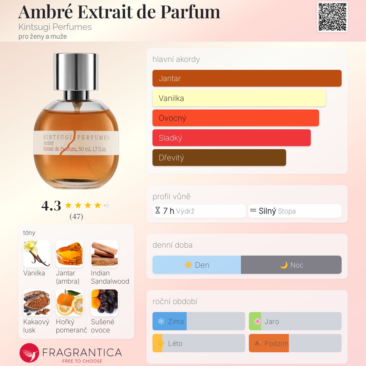 Ambré Extrait de Parfum podle Kintsugi Perfumes je Orientální vůně pro ženy a muže. Toto je nová vůně. Ambré Extrait de Parfum byl/a uveden/a v roce 2024. "Nosem" za touto vůní je Martin Švach. Vrchní tóny jsou Kakao, Hořký pomeranč, Sušené ovoce, Rum a Paprika; střední tóny jsouŠvestka, Dub, Vonokvětka, Neroli a Fazole tonka ; základní tóny jsou Vanilka, Jantar (ambra), Indian Sandalwood, Myrha a Labdanum.