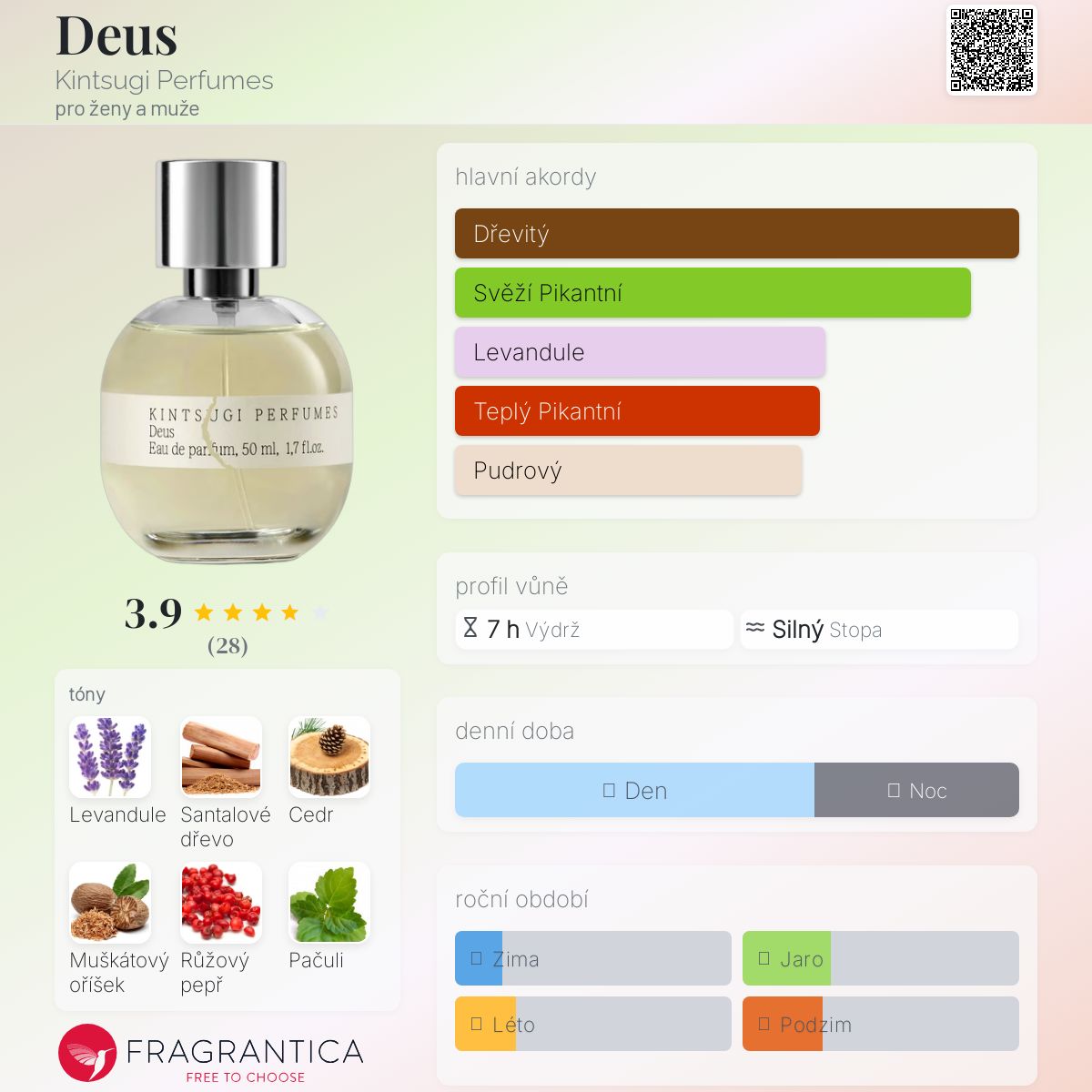 Deus podle Kintsugi Perfumes je Woody Spicy vůně pro ženy a muže. Deus byl/a uveden/a v roce 2021. "Nosem" za touto vůní je Martin Švach. Vrchní tóny jsou Levandule, Muškátový oříšek a Růžový pepř; střední tóny jsouPačuli, Černý pepř a Zázvor ; základní tóny jsou Santalové dřevo, Cedr, Jantar (ambra) a Agarové dřevo (oud).