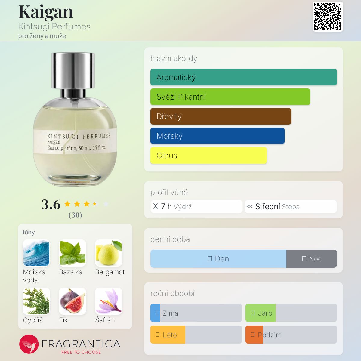 Kaigan podle Kintsugi Perfumes je Aromatic Aquatic vůně pro ženy a muže. Kaigan byl/a uveden/a v roce 2021. "Nosem" za touto vůní je Martin Švach. Vrchní tóny jsou Bazalka, Bergamot a Cypřiš; střední tóny jsouMořské tóny, Fík a Šafrán ; základní tóny jsou Cedr, Pižmo a Cibetka.