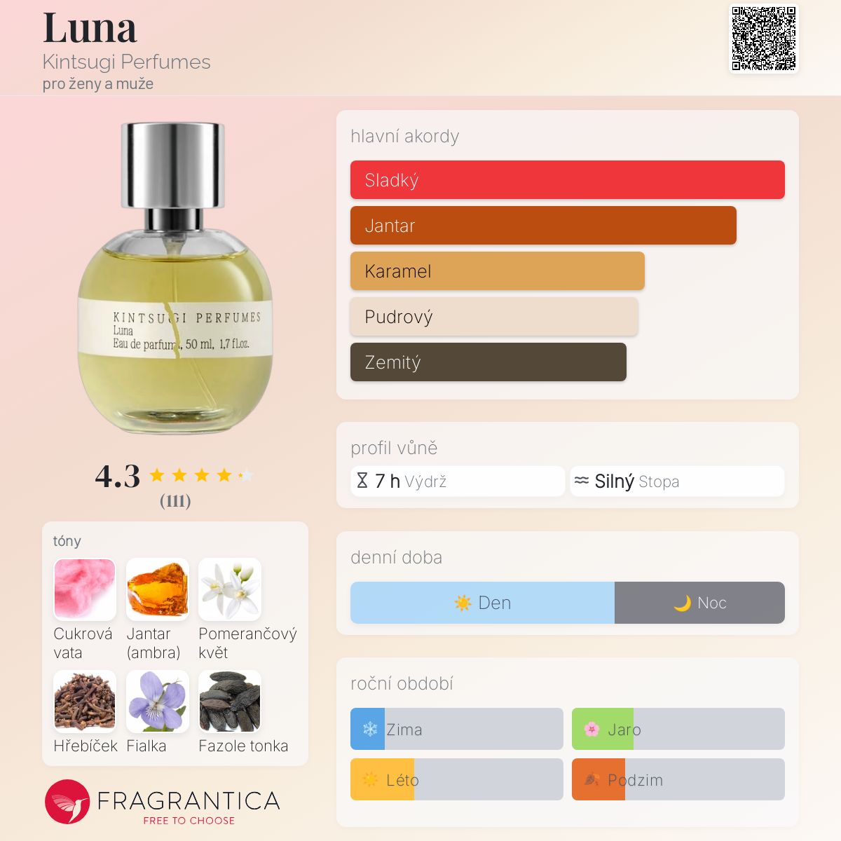 Luna podle Kintsugi Perfumes je Orientální Floral vůně pro ženy a muže. Luna byl/a uveden/a v roce 2021. "Nosem" za touto vůní je Martin Švach. Vrchní tóny jsou Cukrová vata, Pomerančový květ a Hřebíček; střední tóny jsouFialka, Fazole tonka a Ambra ; základní tóny jsou Jantar (ambra), Dubový mech a Vetiver.