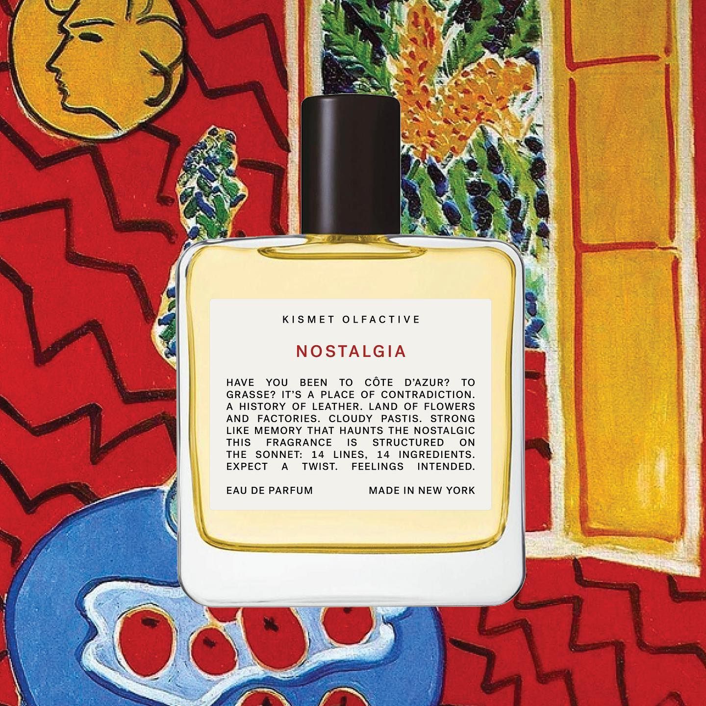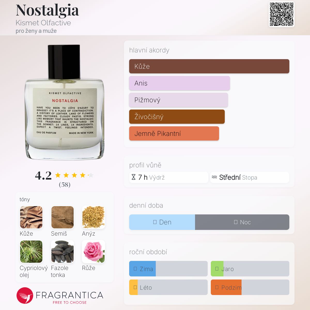 Nostalgia podle Kismet Olfactive je Leather vůně pro ženy a muže. Nostalgia byl/a uveden/a v roce 2018. "Nosem" za touto vůní je Shabnam Tavakol. Vrchní tón je Anýz ; střední tóny jsouFazole tonka a Růže de Mai ; základní tóny jsou Kůže, Semiš a Cypriolový olej.