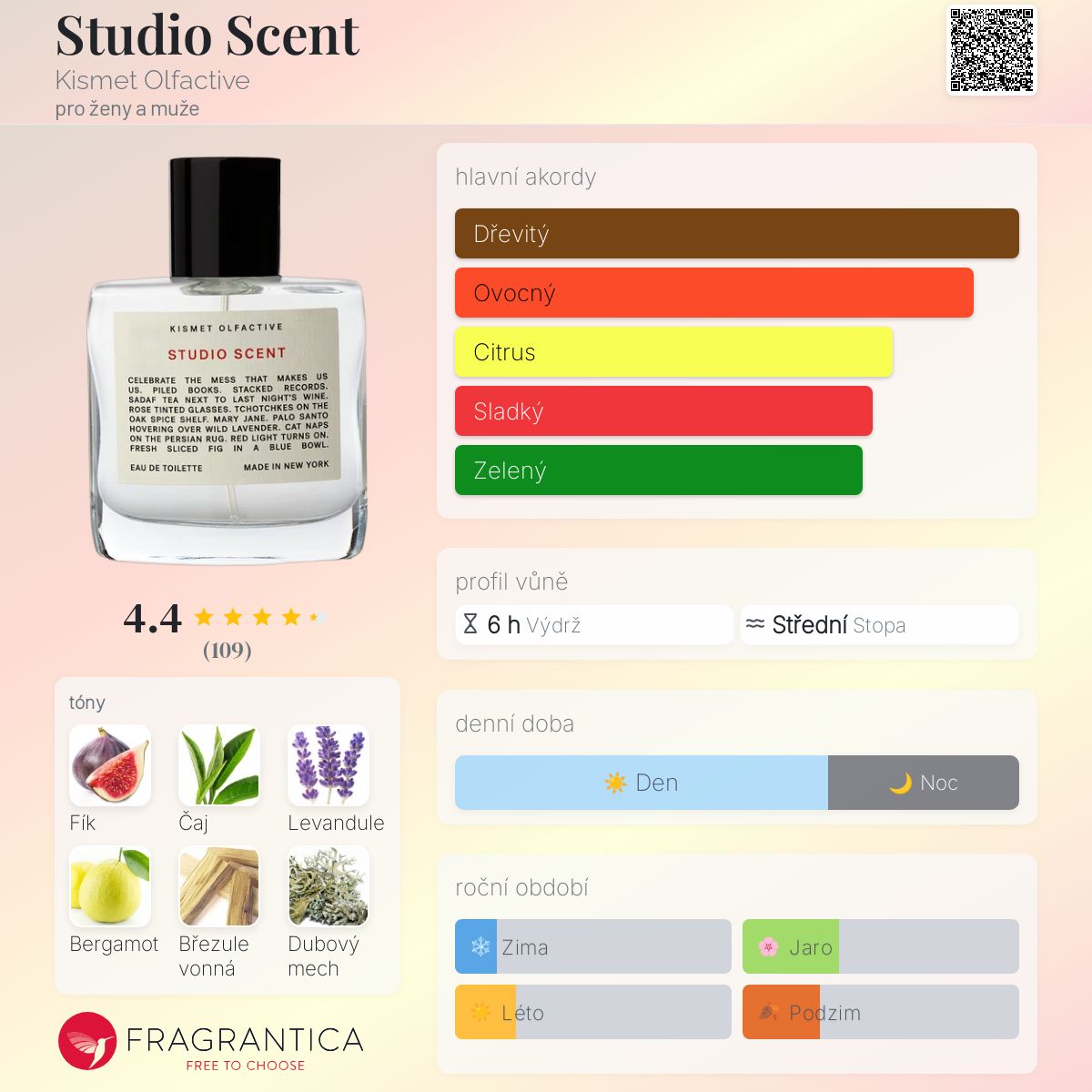 Studio Scent podle Kismet Olfactive je Chypre vůně pro ženy a muže. Studio Scent byl/a uveden/a v roce 2019. "Nosem" za touto vůní je Shabnam Tavakol. Vrchní tón je Bergamot ; střední tóny jsouFík, Černý čaj a Levandule ; základní tóny jsou Březule vonná, Dubový mech a Jantarové dřevo.
