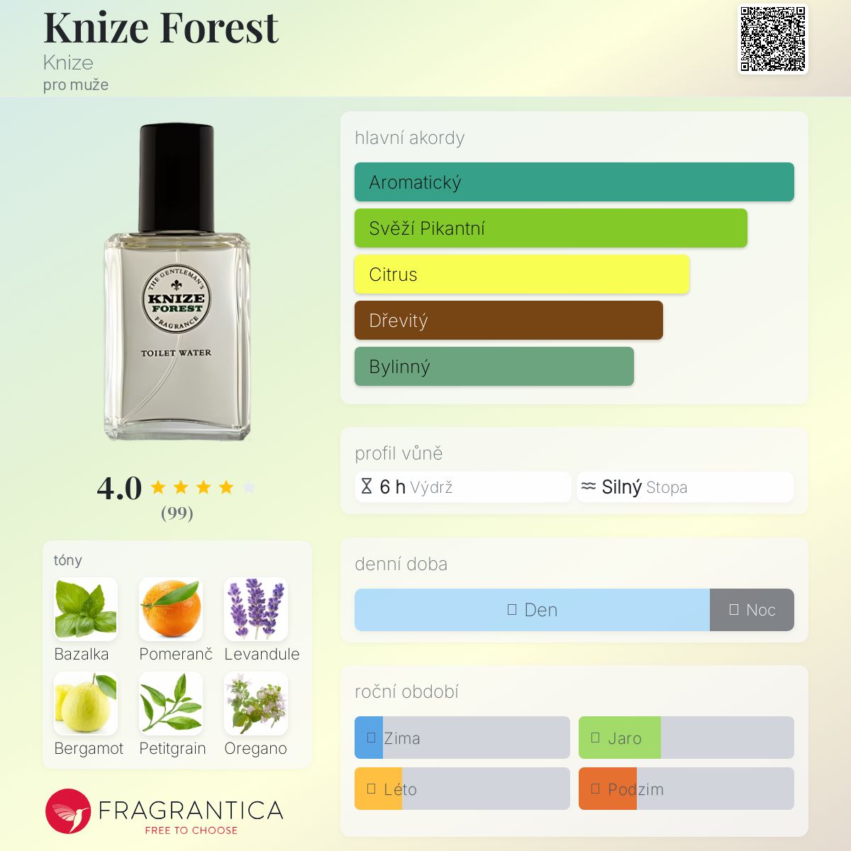 Knize Forest podle Knize je Aromatic Fougere vůně pro muže. Knize Forest byl/a uveden/a v roce 1993. Vrchní tóny jsou Pomeranč, Levandule, Bergamot, Petitgrain a Citron amalfi; střední tóny jsouBazalka, Oregano, Šalvěj, Palisandr, Karafiát, Pelargónie a Rozmarýn ; základní tóny jsou Dubový mech, Vetiver, Santalové dřevo, Pižmo, Jantar (ambra), Francouzské labdanum a Pačuli.