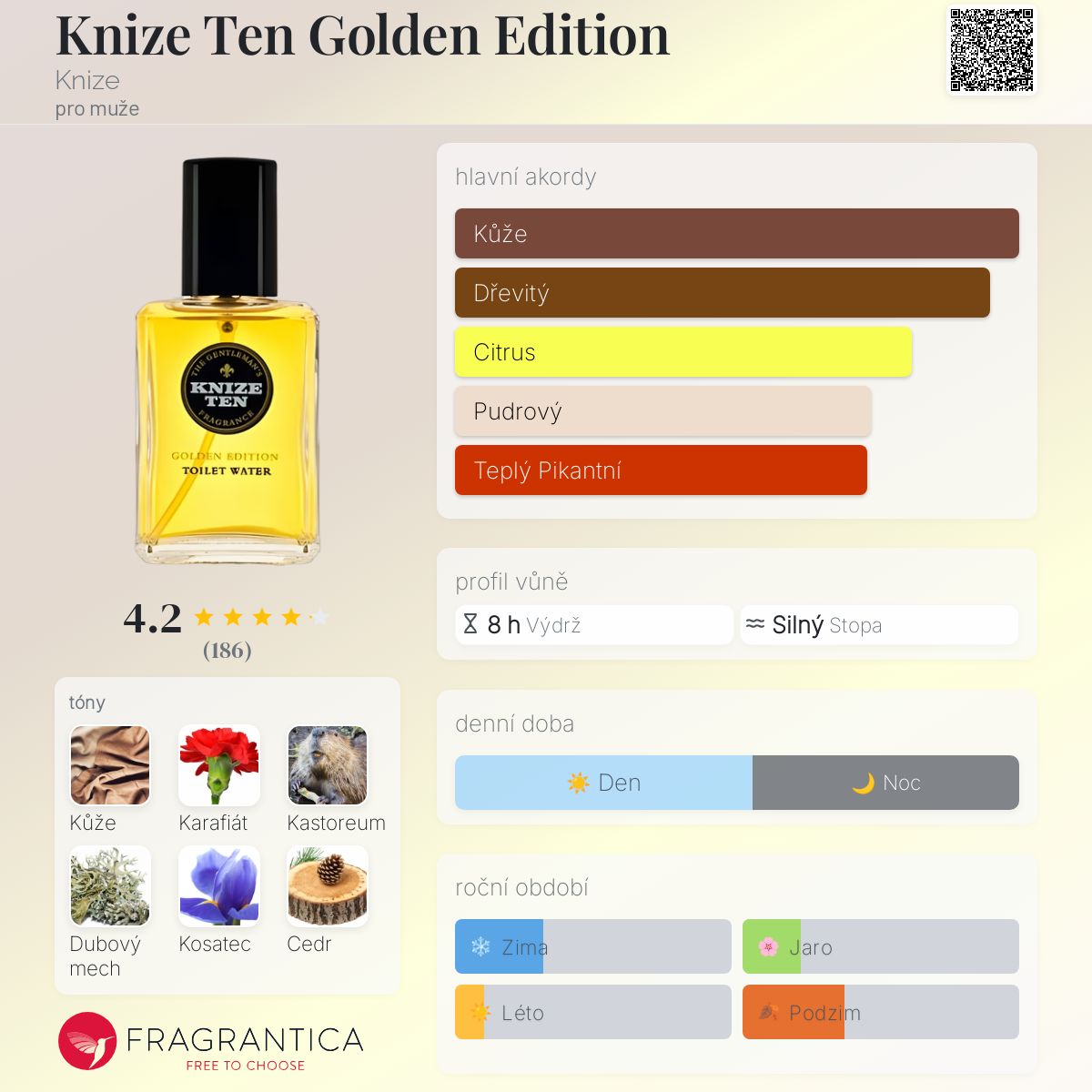 Knize Ten Golden Edition podle Knize je Leather vůně pro muže. Knize Ten Golden Edition byl/a uveden/a v roce 2000. Knize Ten Golden Edition byl/a vytvořen/a Heinz Gottschalk a Vincent Roubert. Vrchní tóny jsou Citron amalfi , Pomeranč, Bergamot a Petitgrain; střední tóny jsouKarafiát, Kosatec, Virginský cedr, Santalové dřevo, Jasmín, Pelargónie, Růže a Skořice ; základní tóny jsou Kůže, Kastoreum, Dubový mech, Vanilka, Jantar (ambra) a Pižmo.