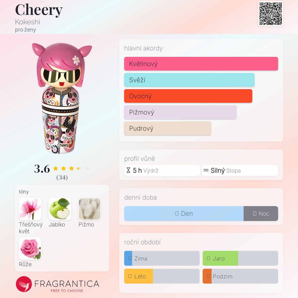 Cheery podle Kokeshi je Floral Fruity vůně pro ženy. Vrchní tón je Jablko ; střední tóny jsouTřešňový květ a Růže ; základní tón je Pižmo.
