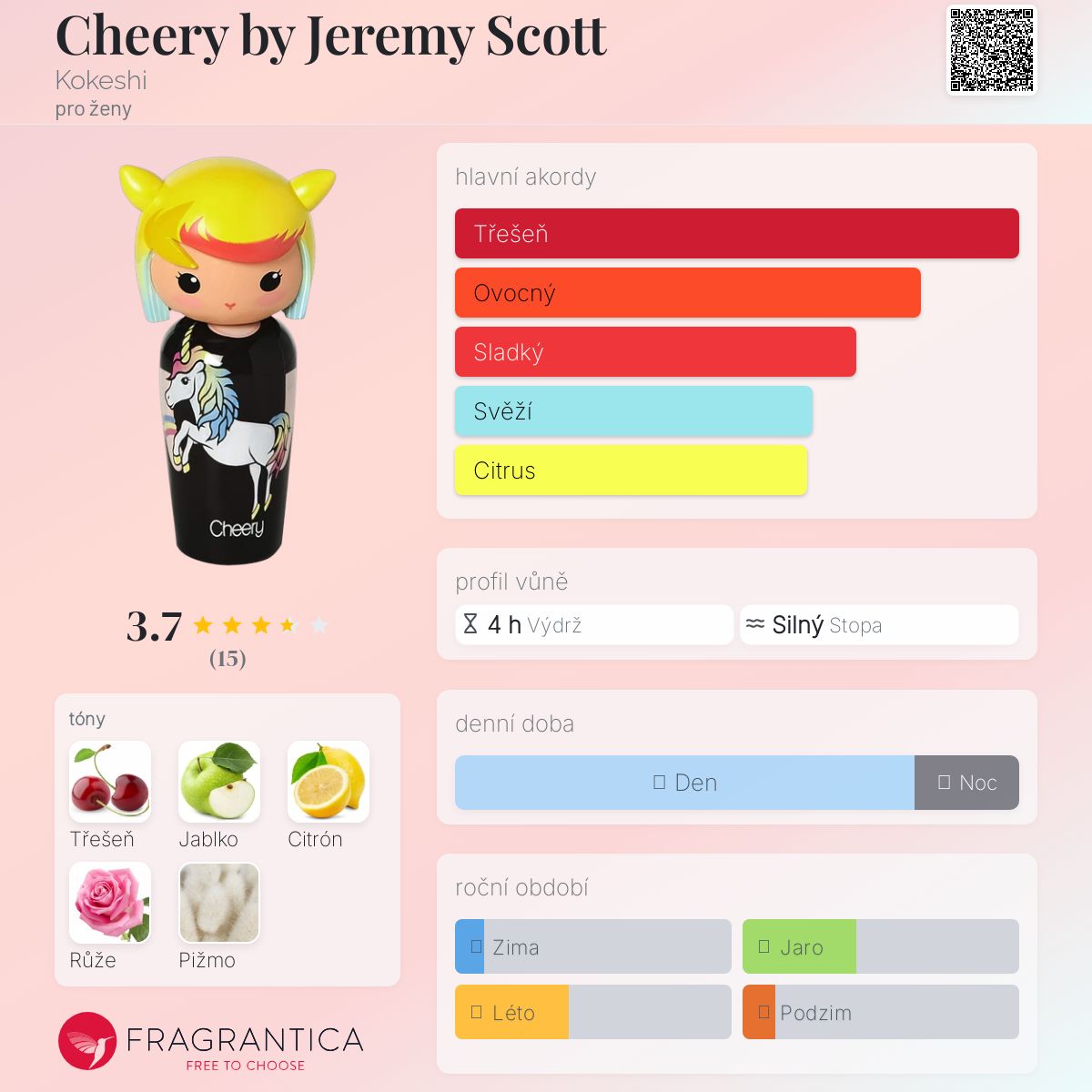 Cheery by Jeremy Scott podle Kokeshi je Floral Fruity vůně pro ženy. Cheery by Jeremy Scott byl/a uveden/a v roce 2016. Vrchní tóny jsou Jablko a Citrón; střední tóny jsouTřešeň a Růže ; základní tón je Bílé pižmo.