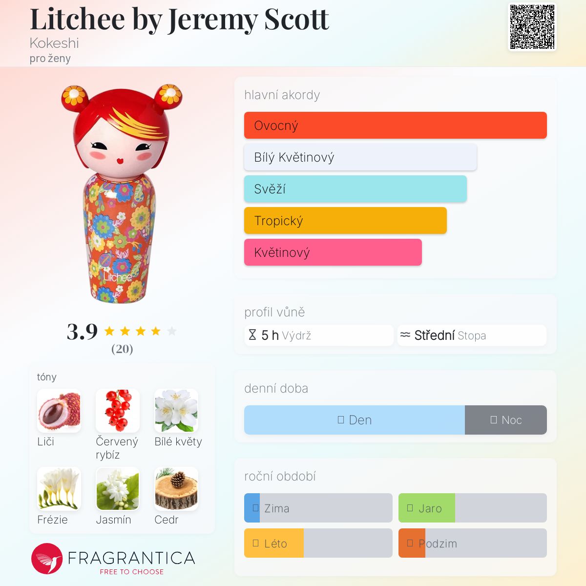 Litchee by Jeremy Scott podle Kokeshi je Floral Fruity vůně pro ženy. Litchee by Jeremy Scott byl/a uveden/a v roce 2016. Vrchní tón je Liči ; střední tóny jsouČervený rybíz, Bílé květy, Frézie a Jasmín ; základní tóny jsou Cedr a Vanilka.