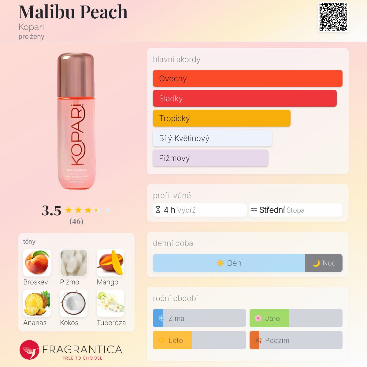 Malibu Peach podle Kopari je Orientální vůně pro ženy. Toto je nová vůně. Malibu Peach byl/a uveden/a v roce 2024. Vrchní tóny jsou Bílá broskev, Mango a Ananas; střední tóny jsouKokos, Tuberóza, Jasmín a Bílé květy ; základní tóny jsou Pižmo, Pralinka a Jantar (ambra).