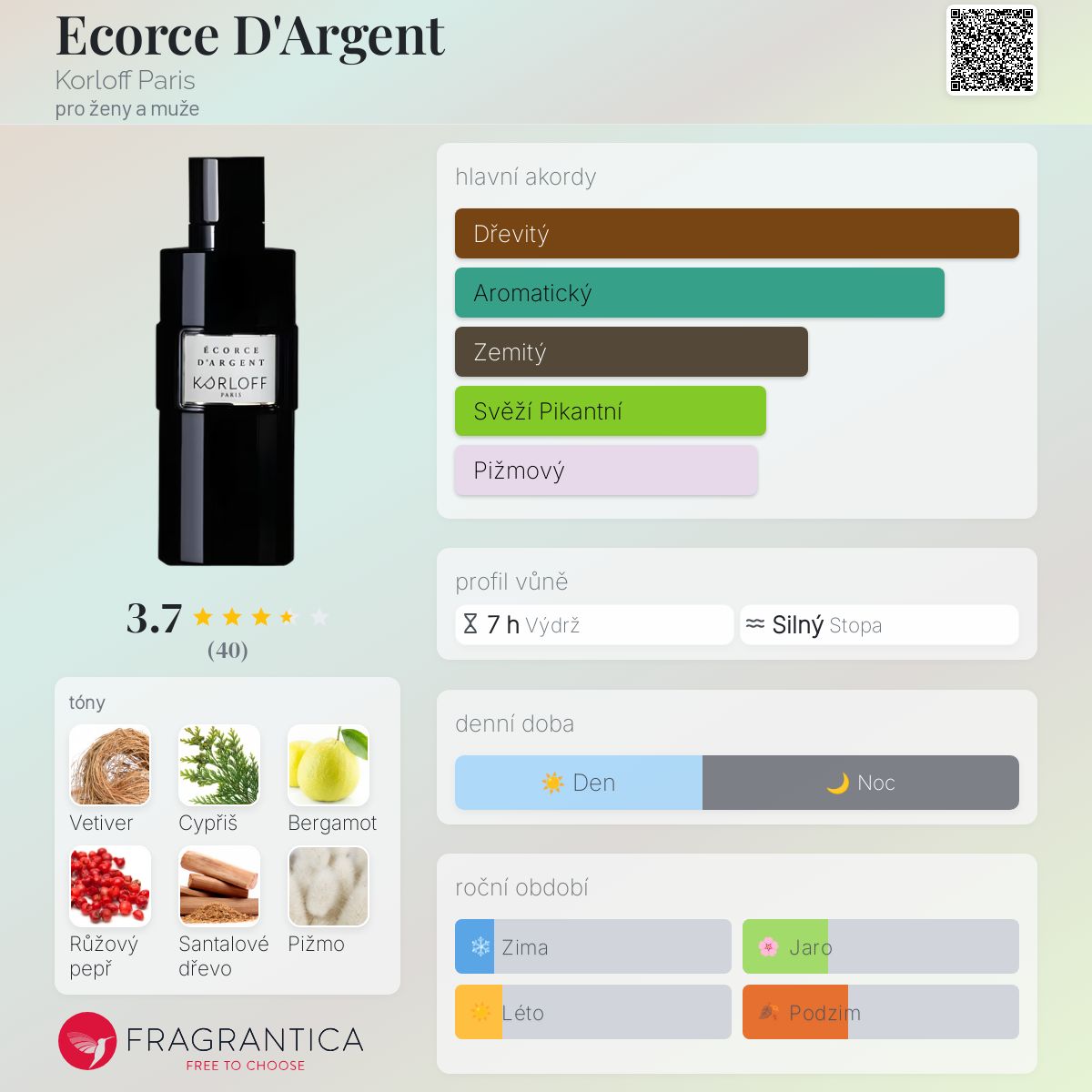 Ecorce D'Argent podle Korloff Paris je vůně pro ženy a muže. Ecorce D'Argent byl/a uveden/a v roce 2018. Vrchní tóny jsou Bergamot a Růžový pepř; střední tóny jsouVetiver a Cypřiš ; základní tóny jsou Santalové dřevo a Pižmo.