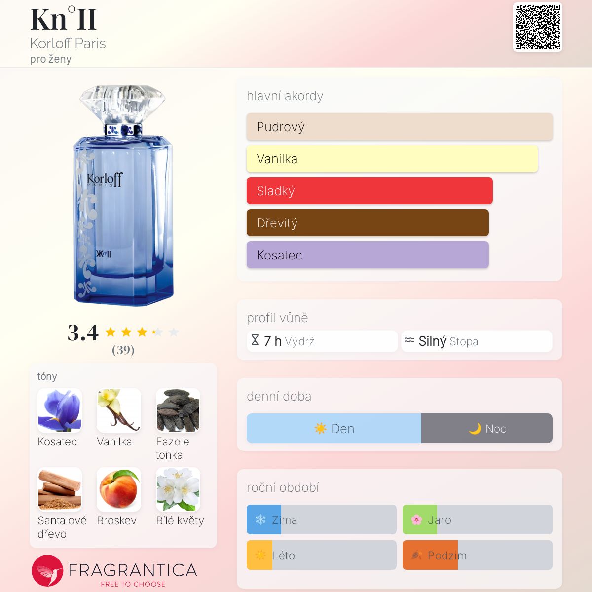 Kn°II podle Korloff Paris je Orientální vůně pro ženy. Kn°II byl/a uveden/a v roce 2008. "Nosem" za touto vůní je Julien Rasquinet. Vrchní tóny jsou Broskev, Ananas, Grapefruit a Mandarinka; střední tóny jsouKosatec, Bílé květy a Vetiver ; základní tóny jsou Vanilka, Fazole tonka, Santalové dřevo a Pižmo.