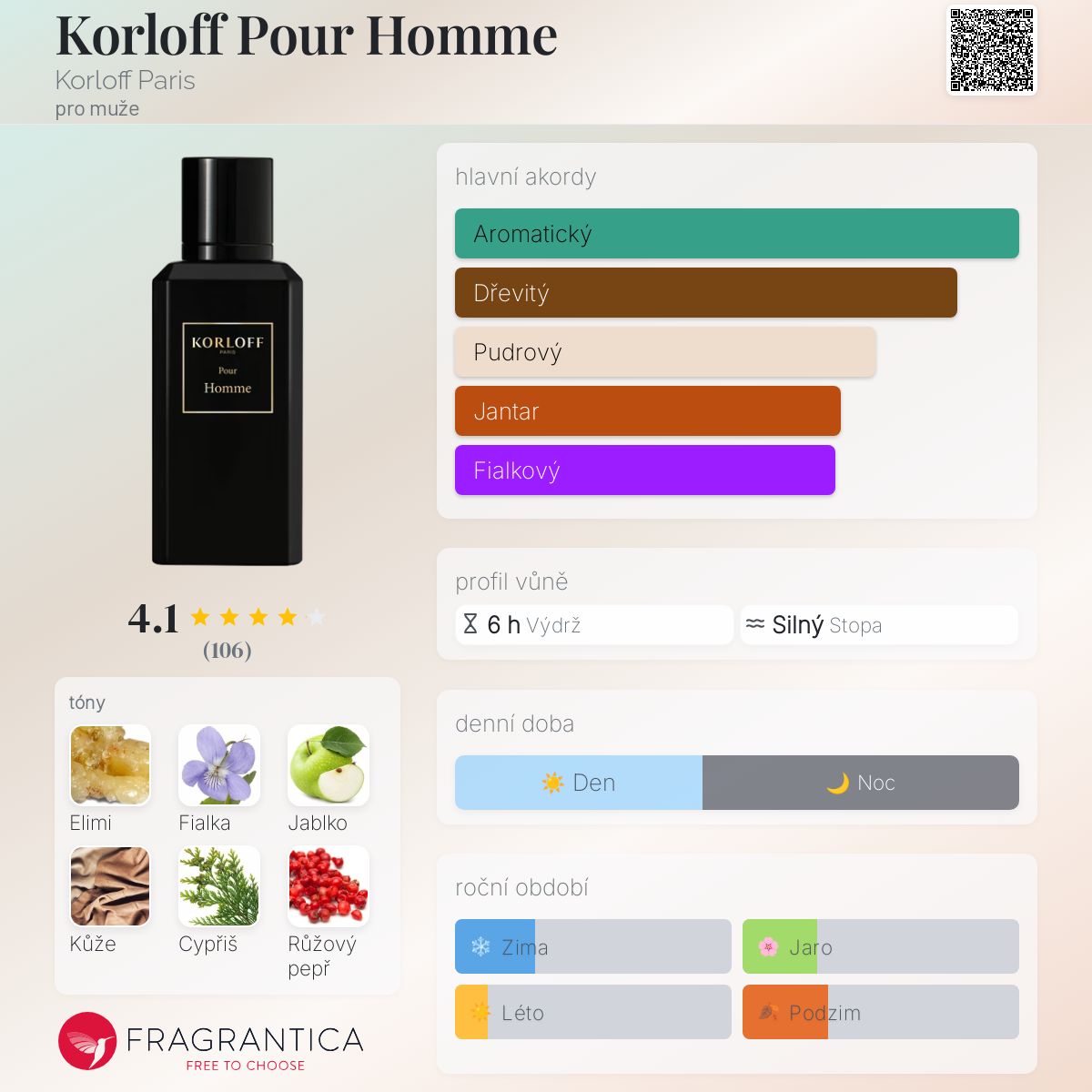 Korloff Pour Homme podle Korloff Paris je Woody Spicy vůně pro muže. Korloff Pour Homme byl/a uveden/a v roce 2019. Vrchní tóny jsou Pryskyřice elimi, Jablko, Cypřiš a Kardamom; střední tóny jsouFialka, Růžový pepř a Marocký cedr ; základní tóny jsou Kůže, Balzám Tolu, Vetiver a Jantar (ambra).