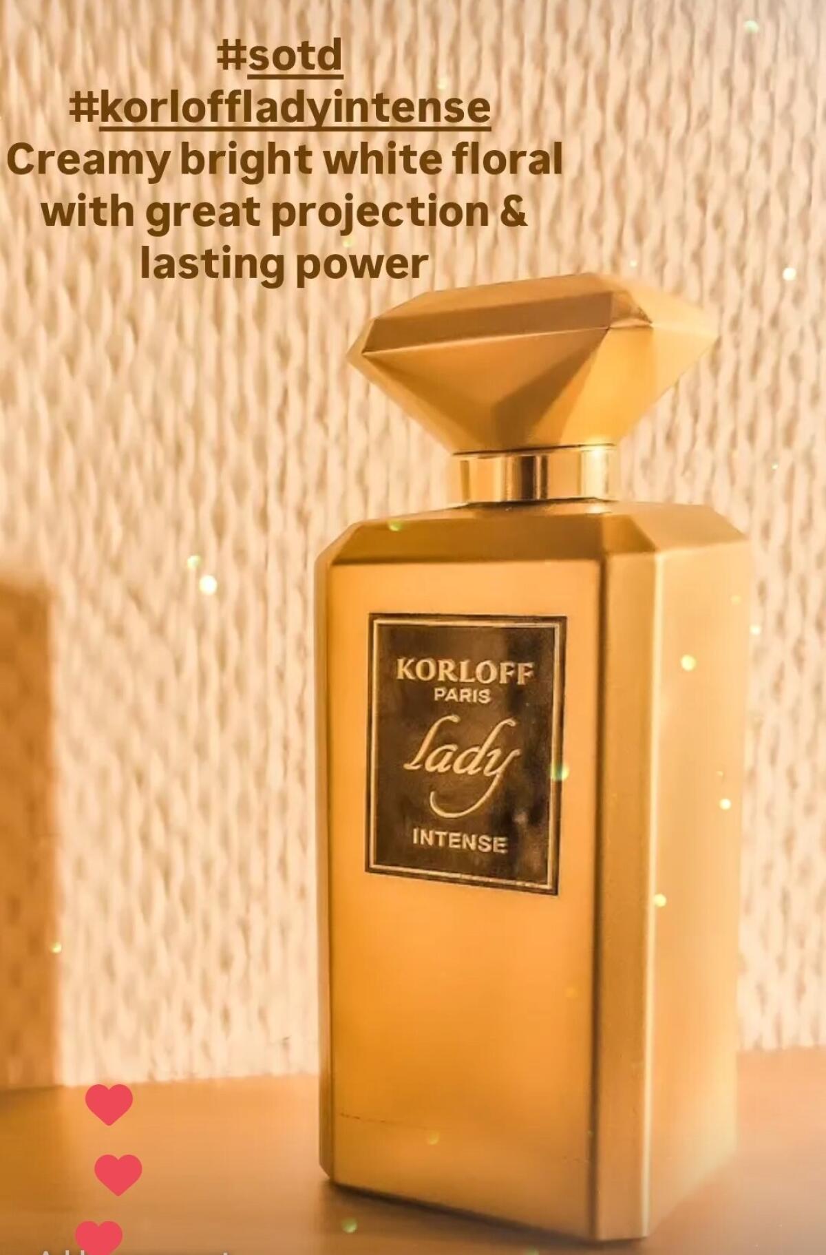 Lady Korloff Intense podle Korloff Paris je Floral Woody Musk vůně pro ženy. Lady Korloff Intense byl/a uveden/a v roce 2017. Vrchní tóny jsou Hruška, Pomeranč a Mandarinka; střední tóny jsouTuberóza, Jasmín a Pomerančový květ ; základní tóny jsou Santalové dřevo, Pižmo a Cedr.