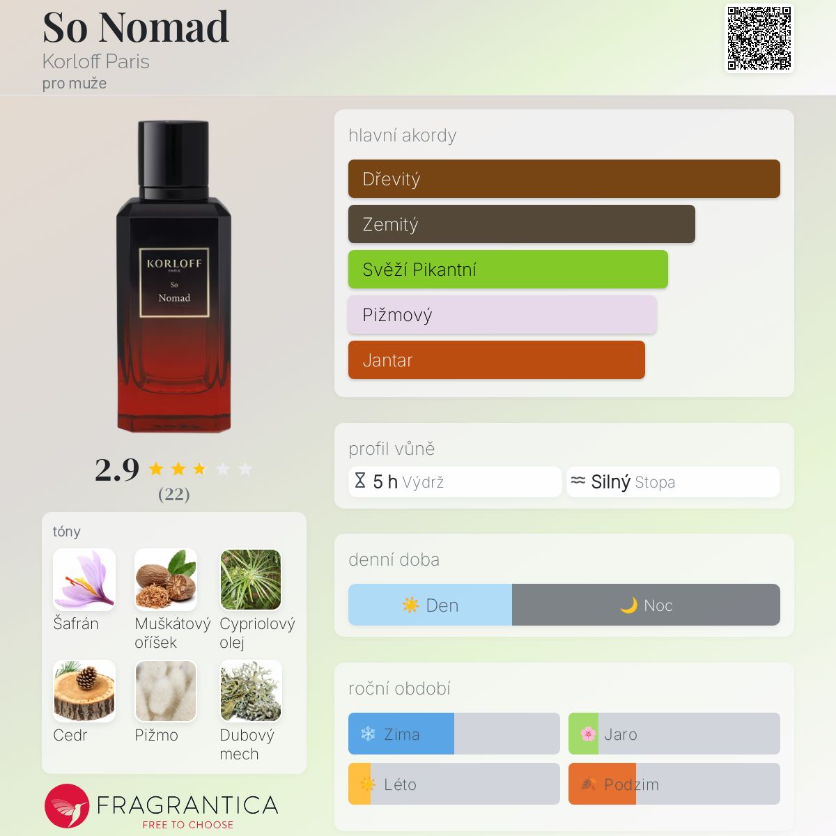 So Nomad podle Korloff Paris je vůně pro muže. Toto je nová vůně. So Nomad byl/a uveden/a v roce 2024. Vrchní tóny jsou Šafrán, Muškátový oříšek a Aksamitník; střední tóny jsouCypriolový olej, Cedr, Labdanum a Růže ; základní tóny jsou Pižmo, Mech, Agarové dřevo (oud), Jantar (ambra) a Vanilka.