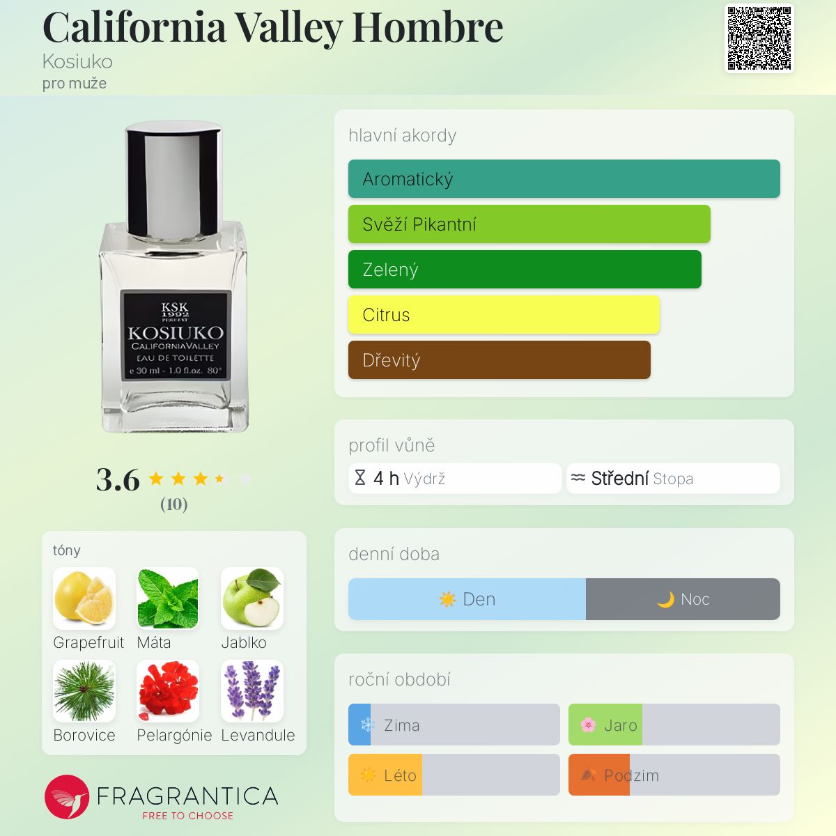 California Valley Hombre podle Kosiuko je Woody Aromatic vůně pro muže. California Valley Hombre byl/a uveden/a v roce 2007. Vrchní tóny jsou Grapefruit, Granny Smith jablko a Levandule; střední tóny jsouMáta, Pelargónie a Šalvěj ; základní tóny jsou Borovice, Pačuli a Virginský cedr.