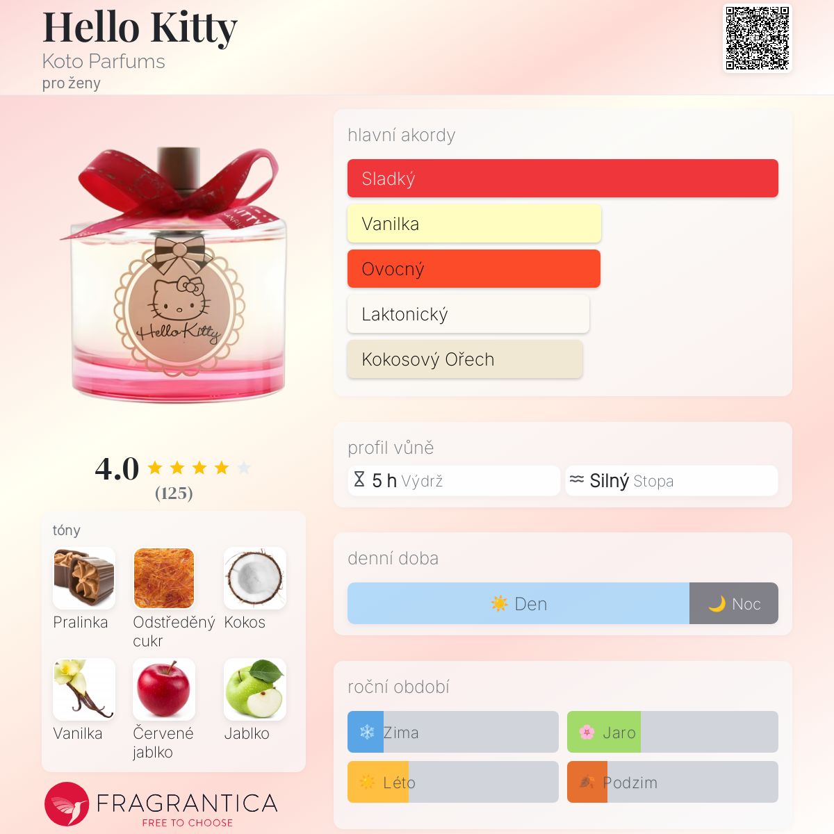 Hello Kitty podle Koto Parfums je Floral Fruity Gourmand vůně pro ženy. Hello Kitty byl/a uveden/a v roce 2008. "Nosem" za touto vůní je Drom. Vrchní tóny jsou Červené jablko a Zelené jablko; střední tóny jsouKokos, Třešňový květ a Jasmín ; základní tóny jsou Pralinka, Cukrové nitě, Vanilka a Pižmo.