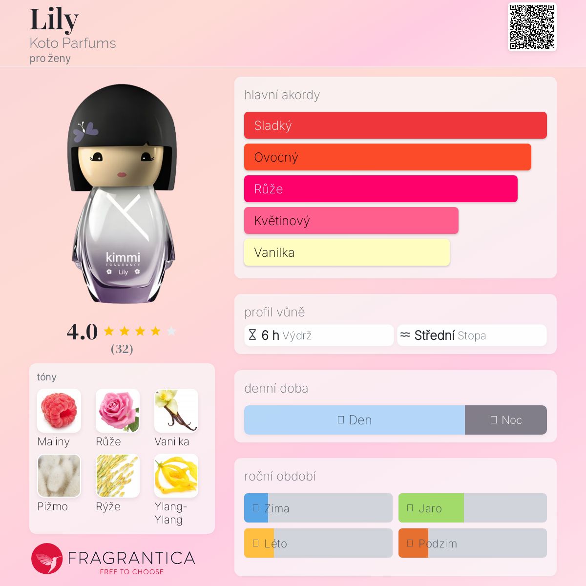 Lily podle Koto Parfums je Floral Fruity vůně pro ženy. Lily byl/a uveden/a v roce 2011. "Nosem" za touto vůní je Alexandra Monet. Vrchní tóny jsou Maliny, Broskev a Zelené tóny; střední tóny jsouRůže, Ylang-Ylang a Pivoňka ; základní tóny jsou Vanilka, Pižmo a Rýže.