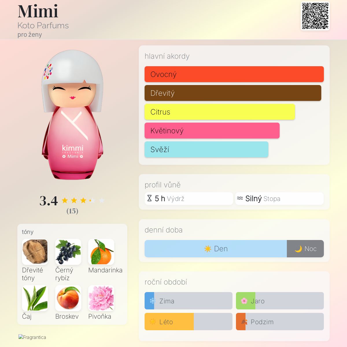 Mimi podle Koto Parfums je Floral Fruity vůně pro ženy. Mimi byl/a uveden/a v roce 2011. "Nosem" za touto vůní je Corinne Cachen. Vrchní tóny jsou Černý rybíz, Mandarinka a Citron amalfi; střední tóny jsouČaj, Broskev, Pivoňka a Fialka ; základní tóny jsou Dřevité tóny, Vanilka a Pižmo.