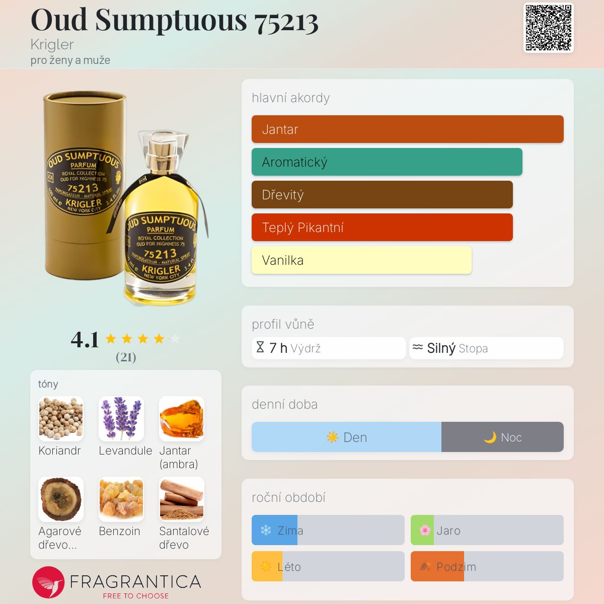 Oud Sumptuous 75213 podle Krigler je Orientální Woody vůně pro ženy a muže. Oud Sumptuous 75213 byl/a uveden/a v roce 2013. Vrchní tóny jsou Koriandr, Agarové dřevo (oud) a Benzoin; střední tóny jsouSantalové dřevo, Levandule, Vanilka a Labdanum ; základní tóny jsou Jantar (ambra), Skořice, Cedr a Papyrus.