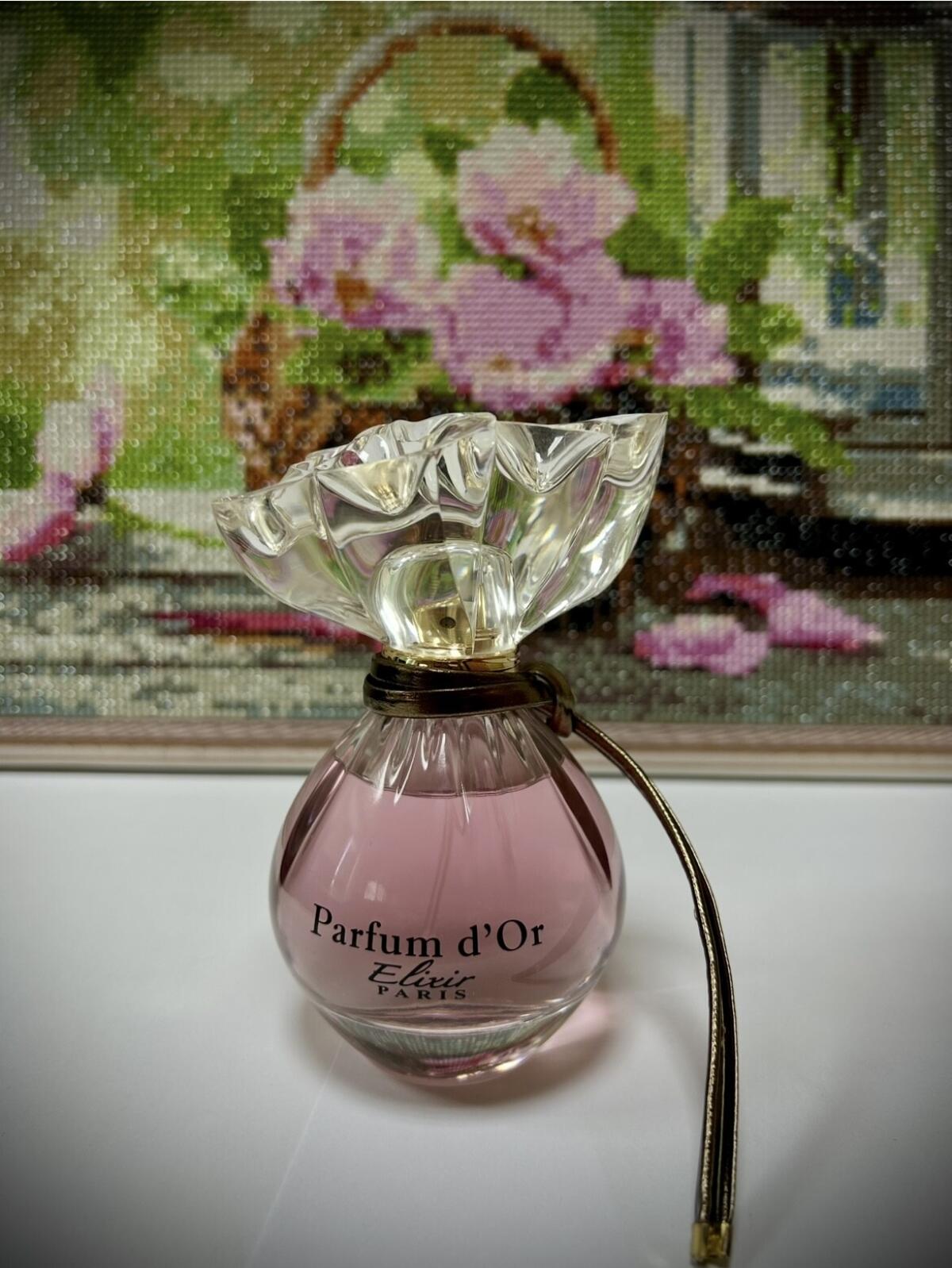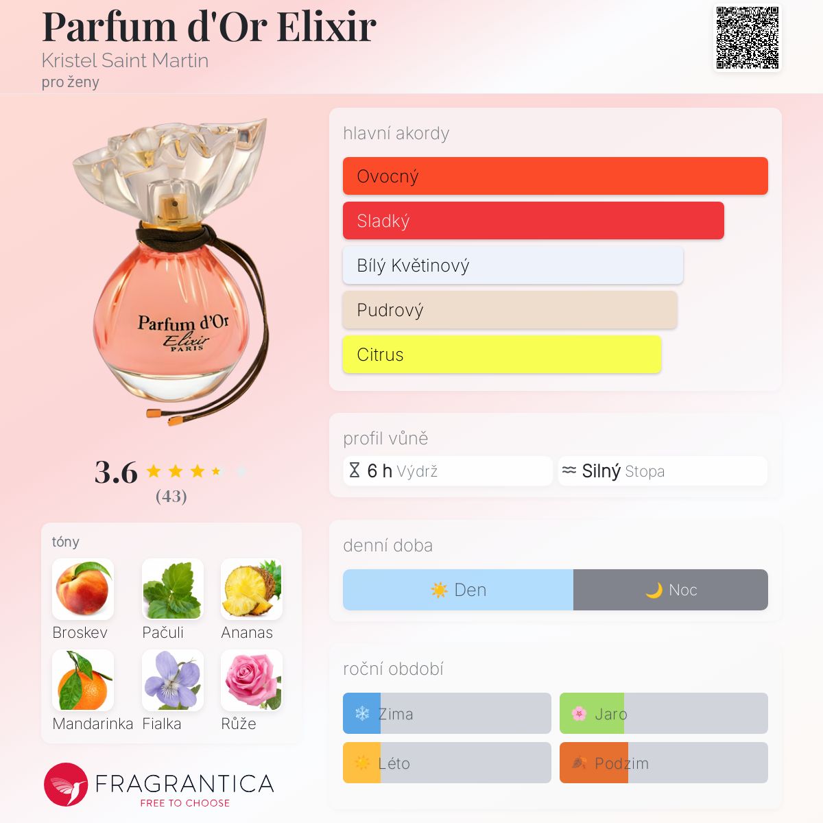 Parfum d'Or Elixir podle Kristel Saint Martin je Floral Fruity vůně pro ženy. Vrchní tóny jsou Broskev, Ananas, Mandarinka, Pomerančový květ a Švestka; střední tóny jsouFialka, Růže, Jasmín, Hřebíček, Šeřík, Ylang-Ylang a Brambořík ; základní tóny jsou Pačuli, Jantar (ambra), Pižmo a Santalové dřevo.