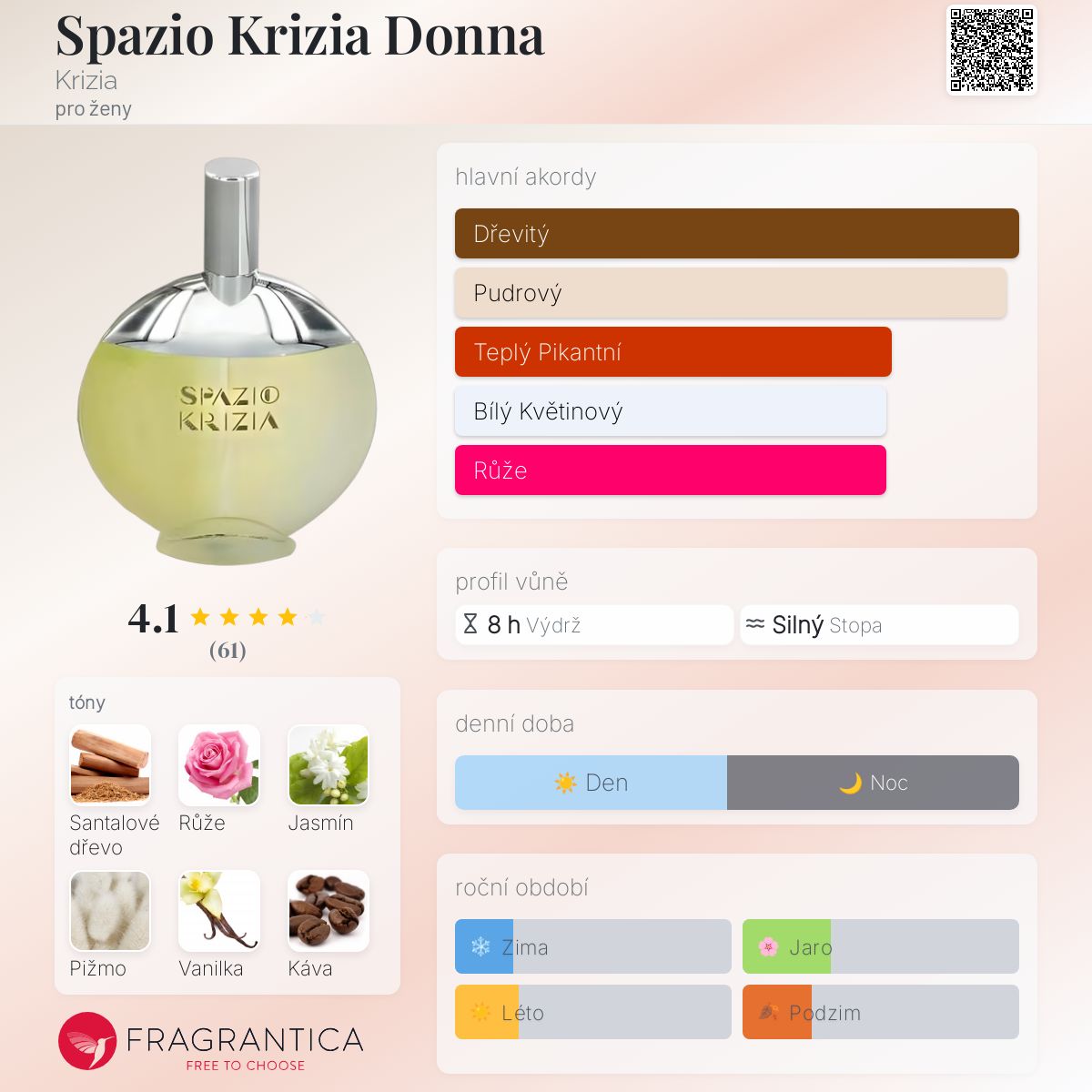 Spazio Krizia Donna podle Krizia je Orientální Floral vůně pro ženy. Spazio Krizia Donna byl/a uveden/a v roce 1997. "Nosem" za touto vůní je Christine Nagel. Vrchní tóny jsou Pražená kávová zrna, Kořeněné tóny, Bergamot, Zelené tóny a Ovocné tóny; střední tóny jsouRůže, Jasmín, Kosatec a Karafiát ; základní tóny jsou Santalové dřevo, Pižmo, Vanilka, Jantar (ambra) a Karamel.